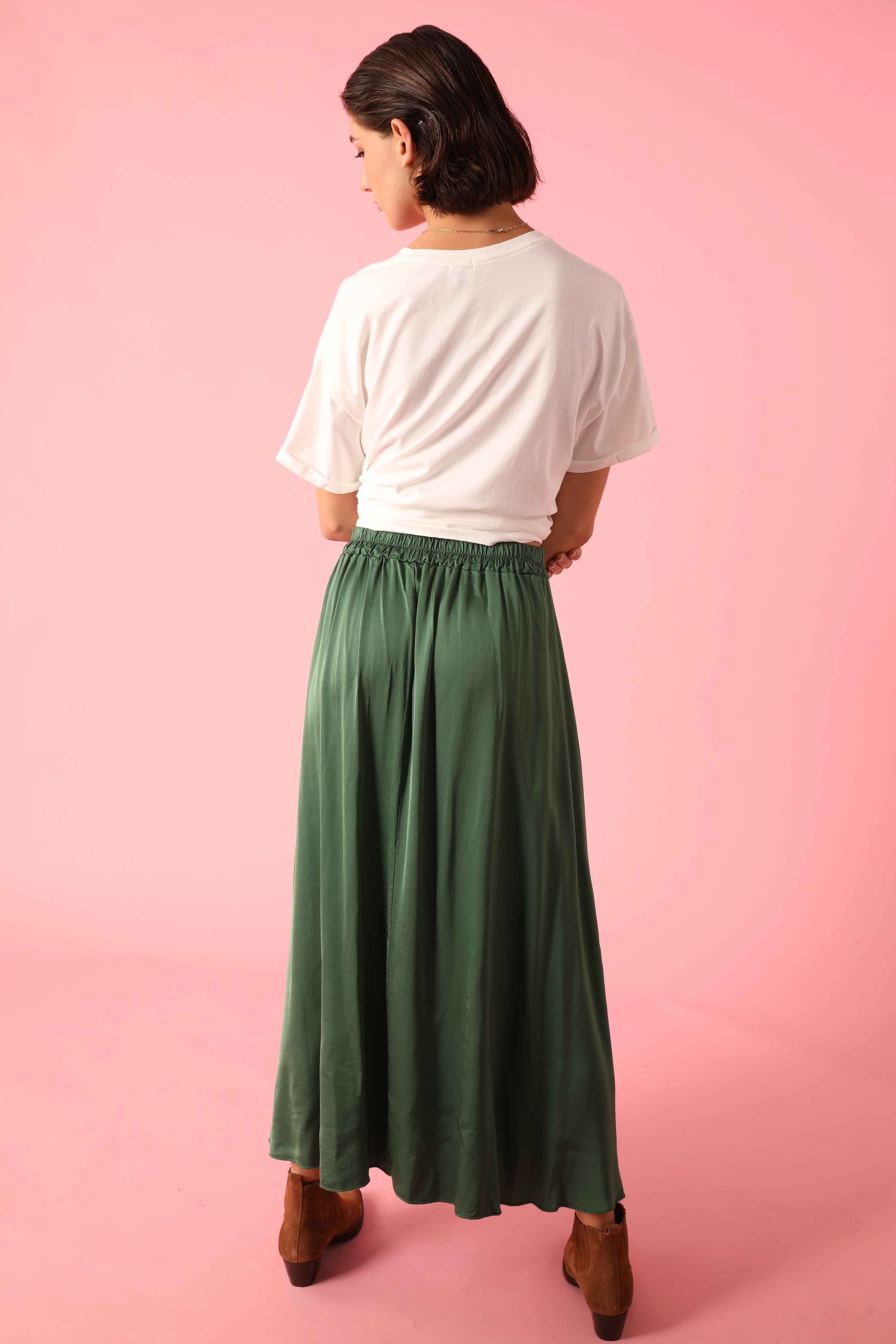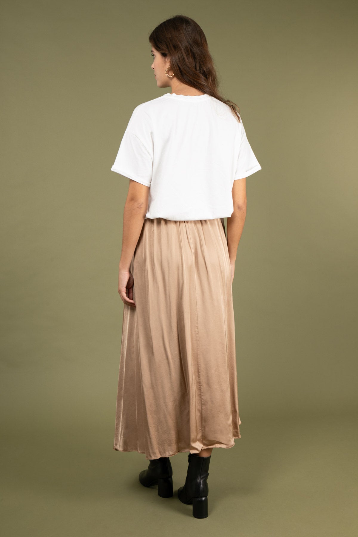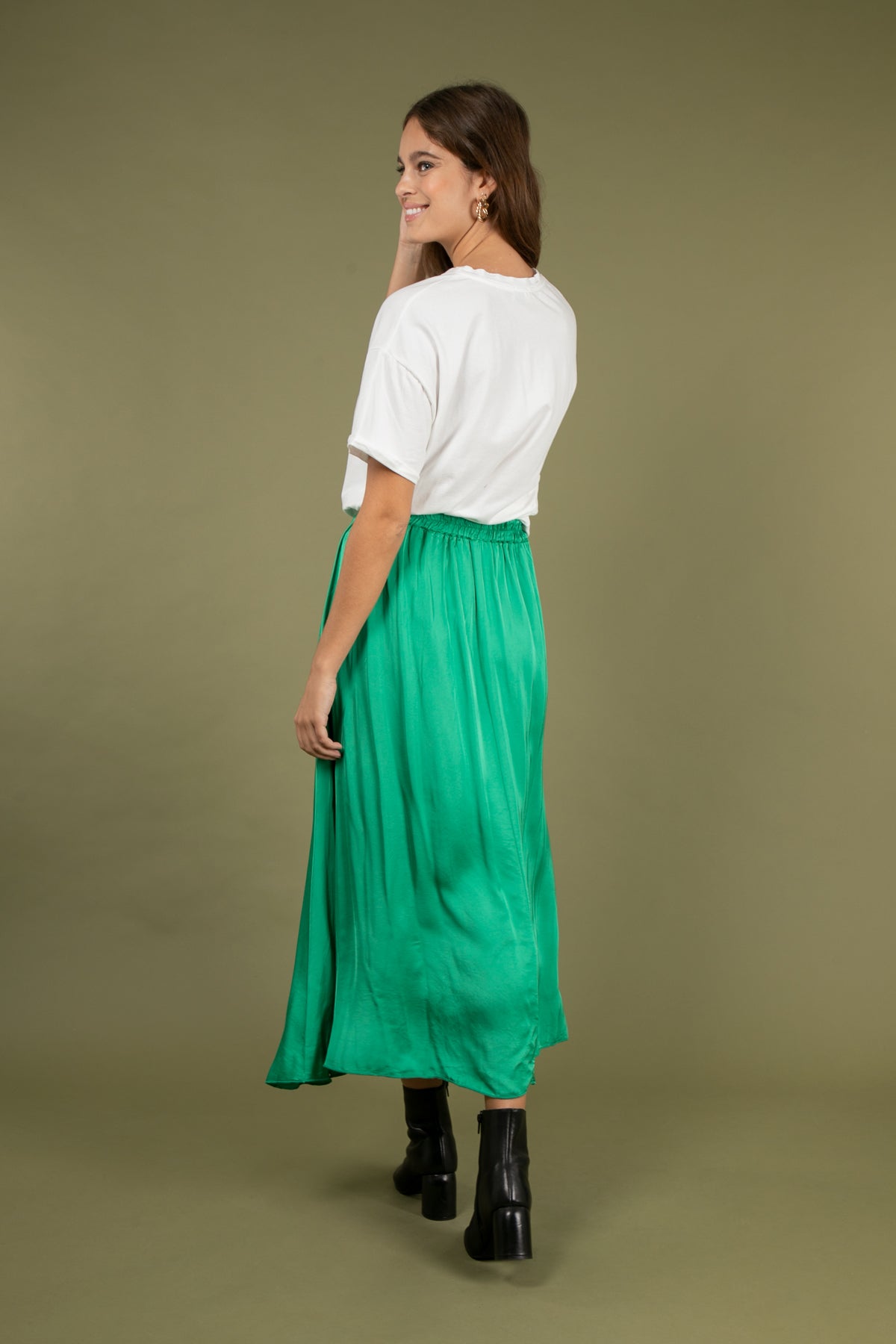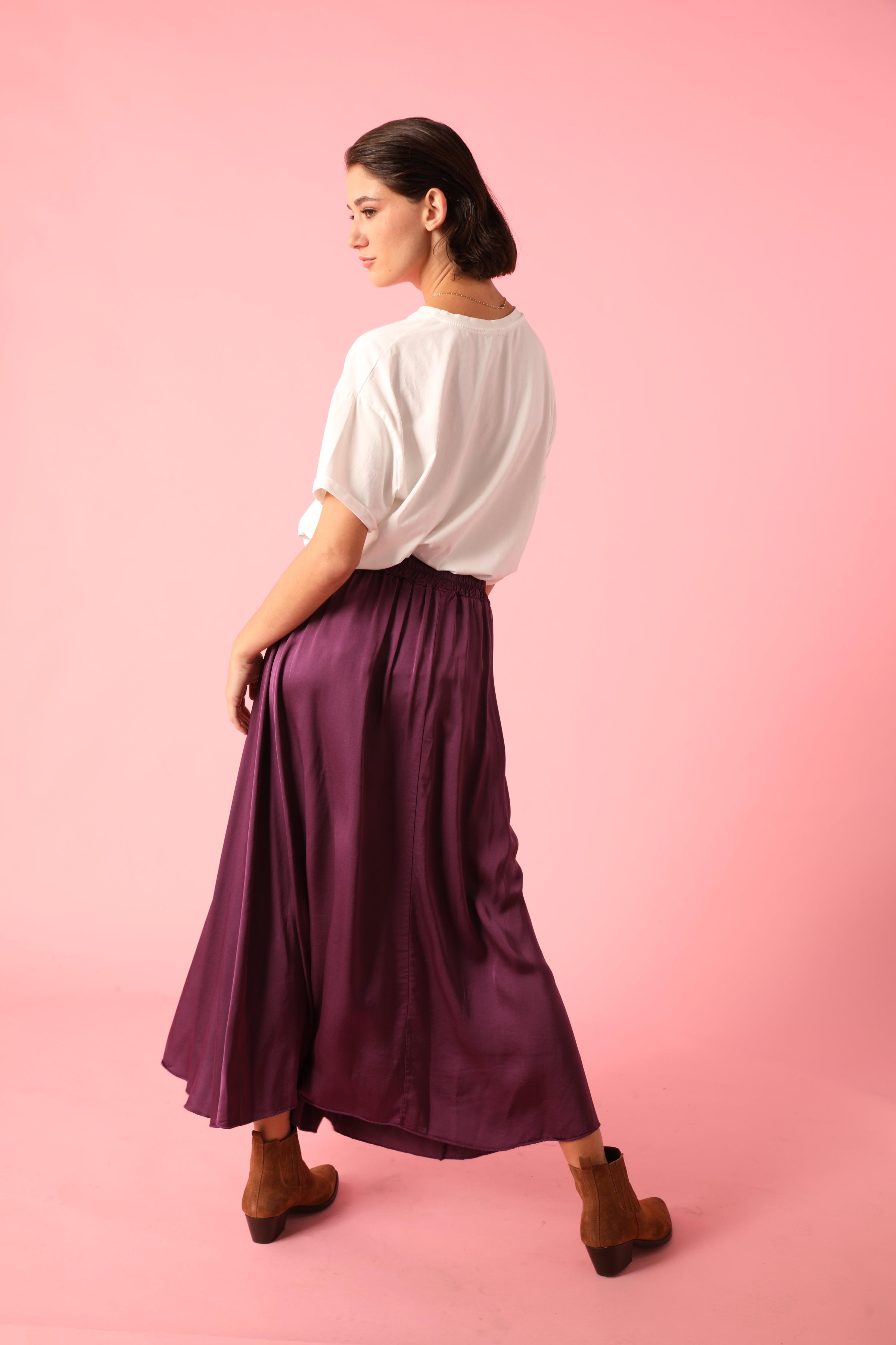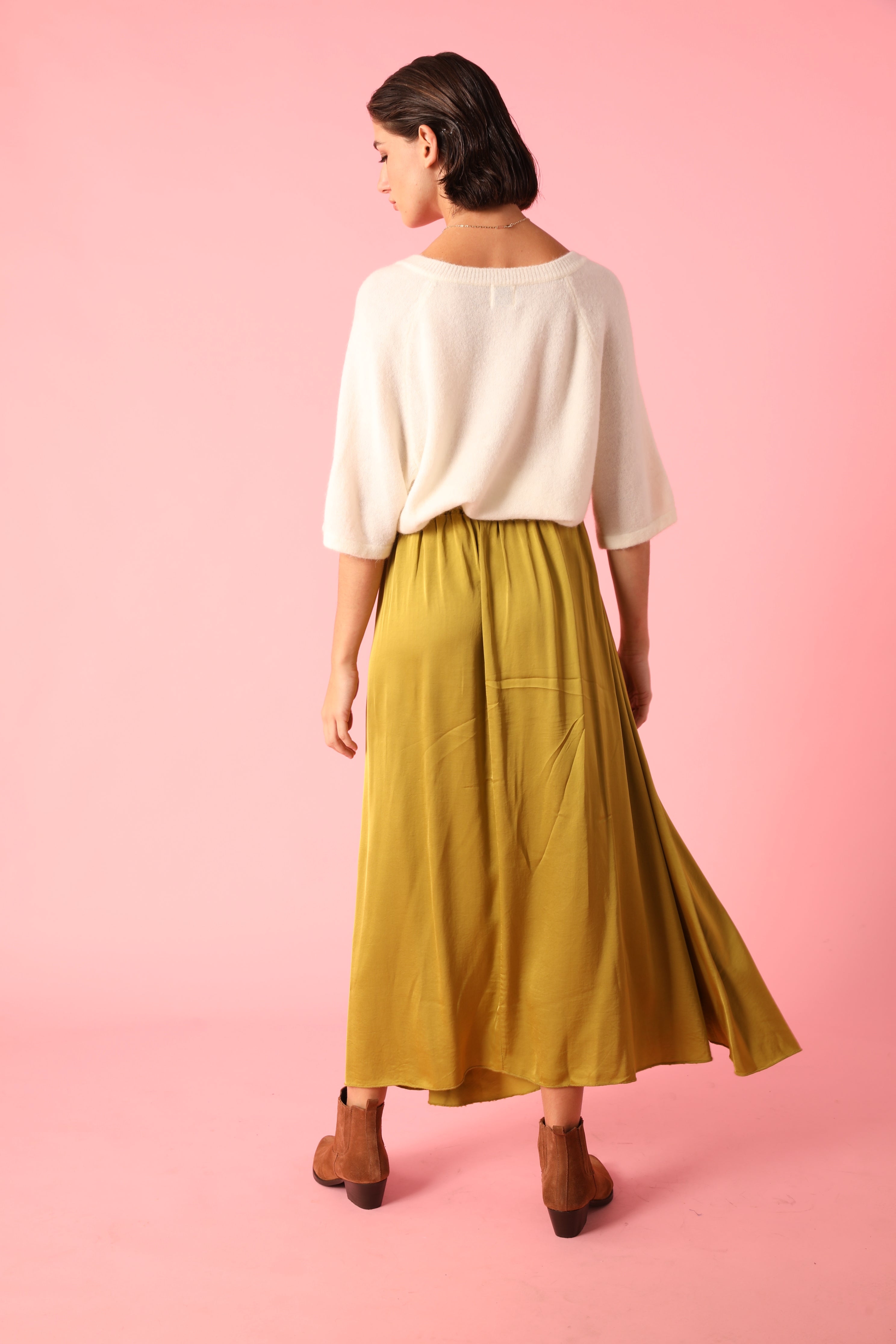 Jupe fluide en soie satinée, taille élastique dans le dos.