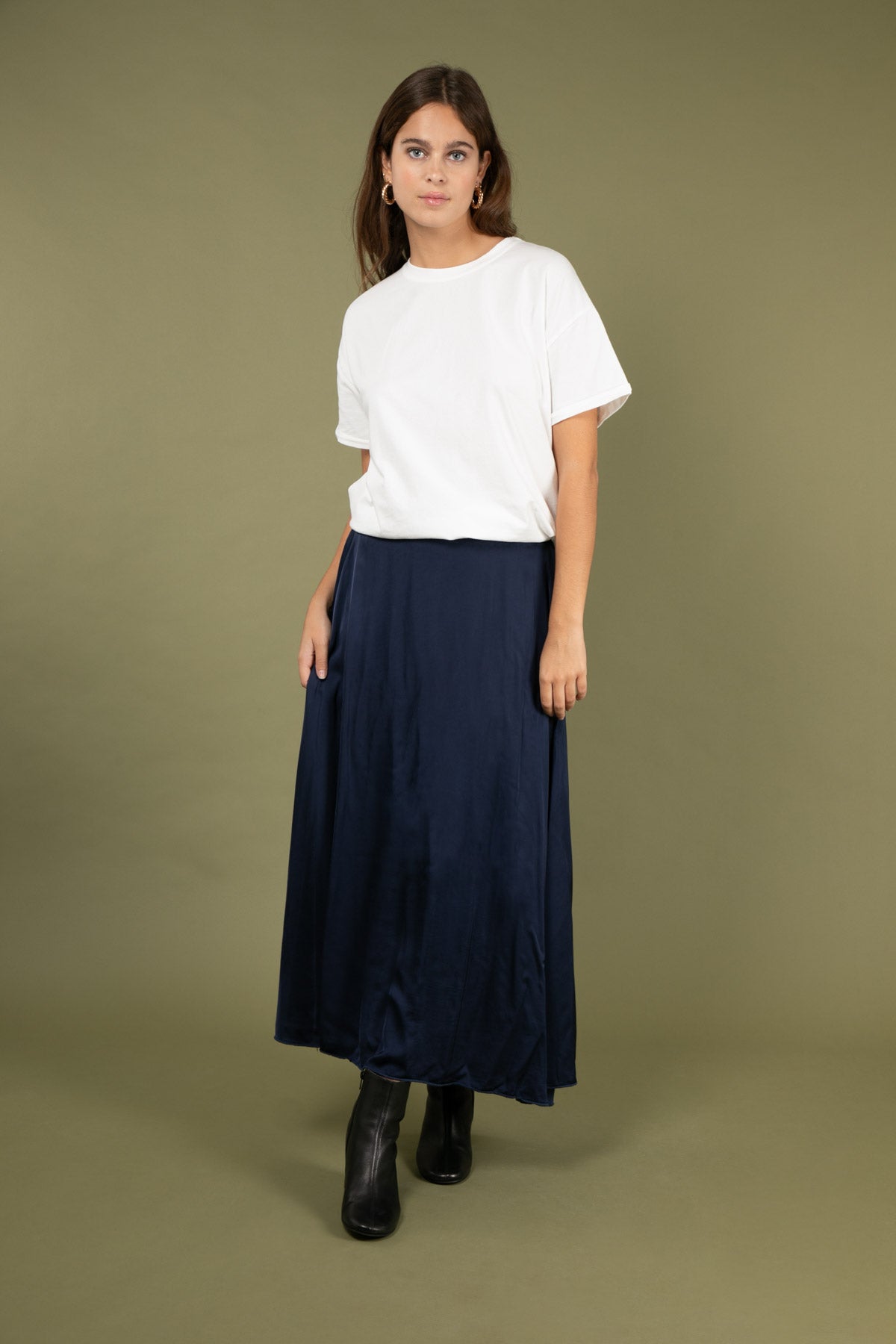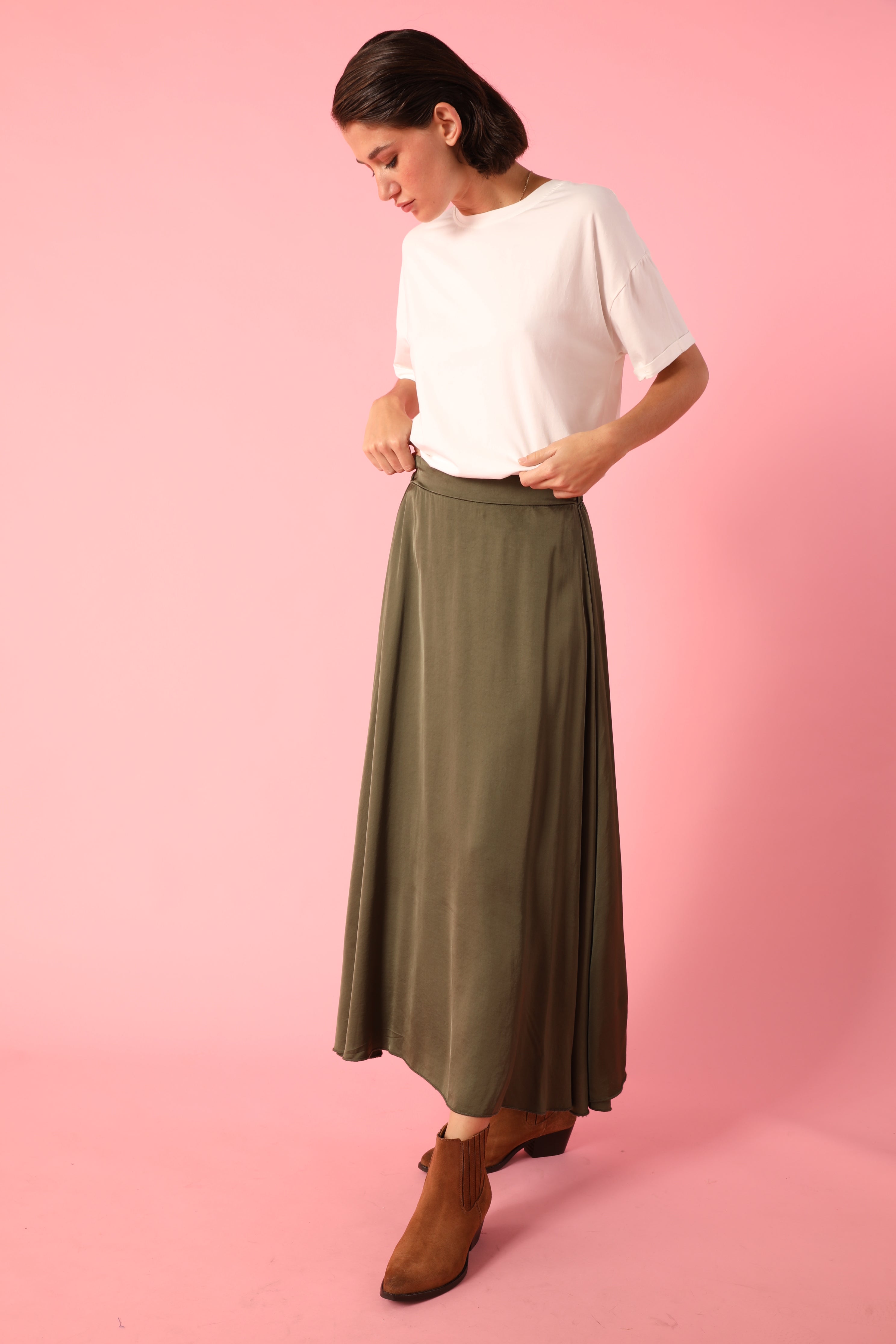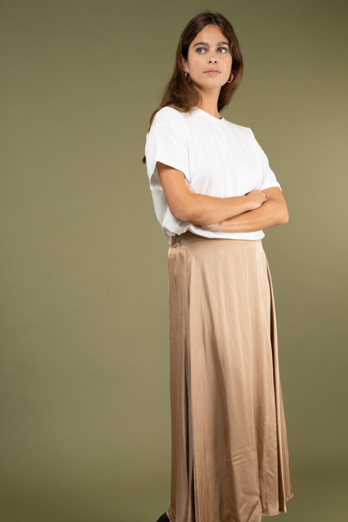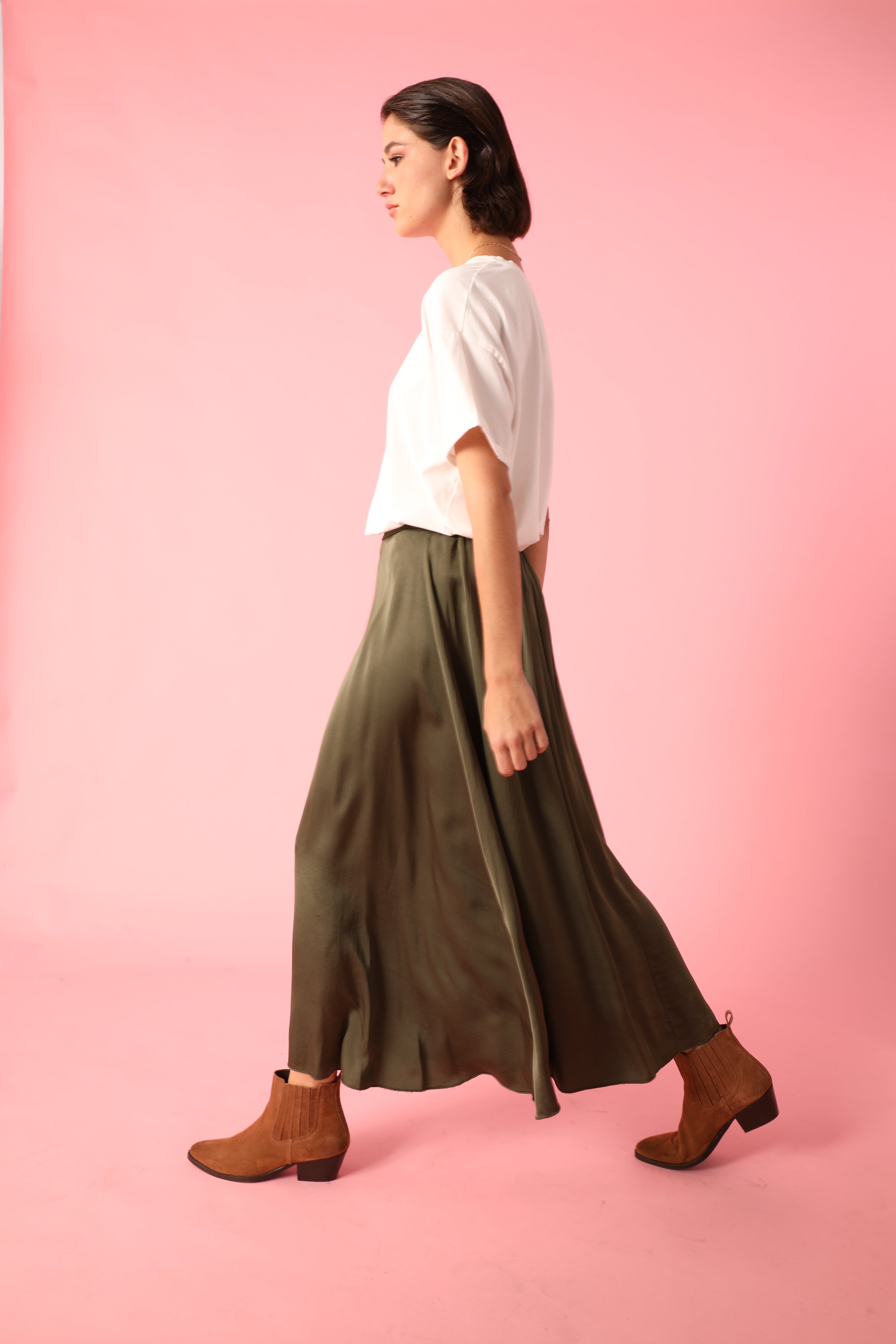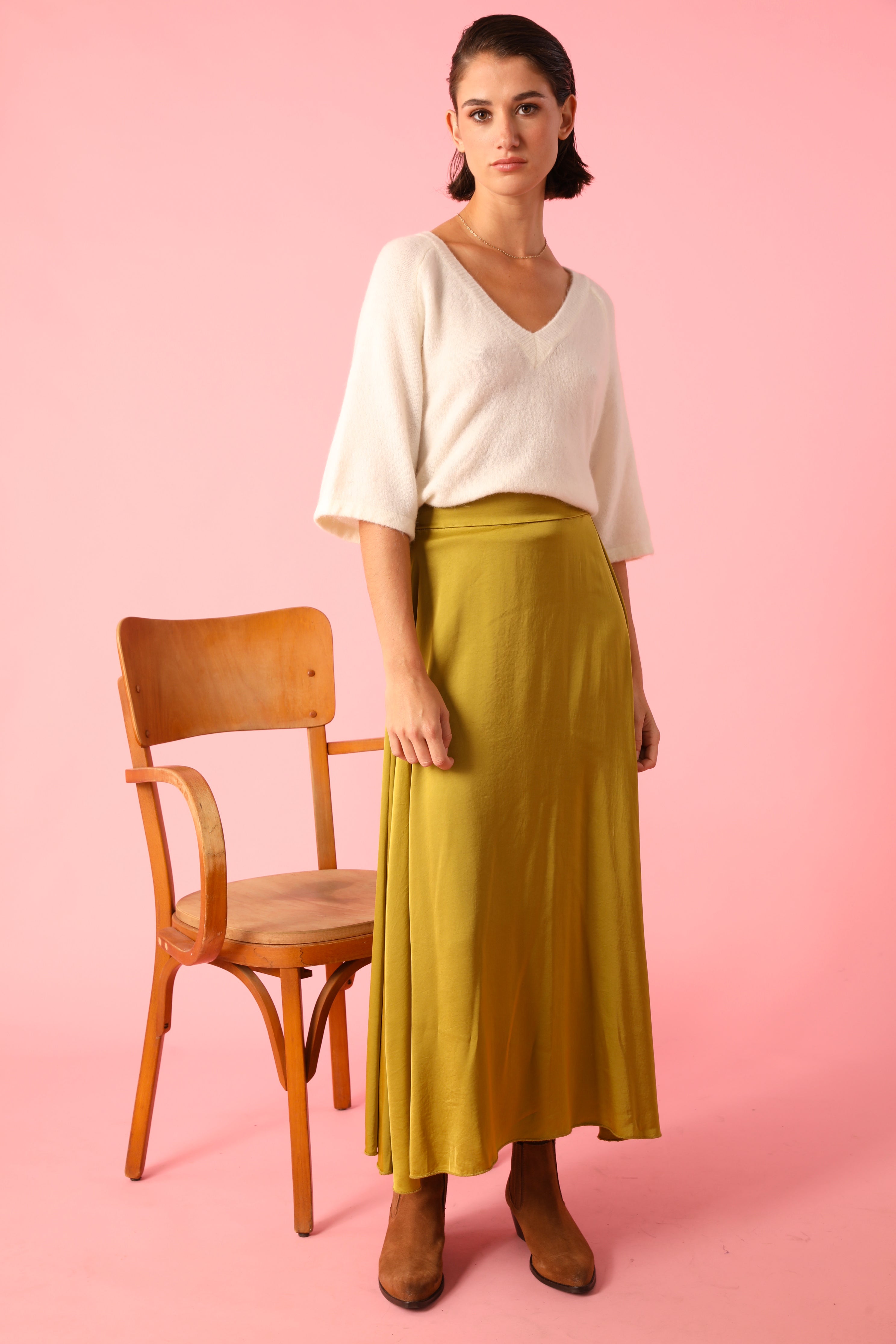 Jupe fluide en soie satinée, taille élastique dans le dos.