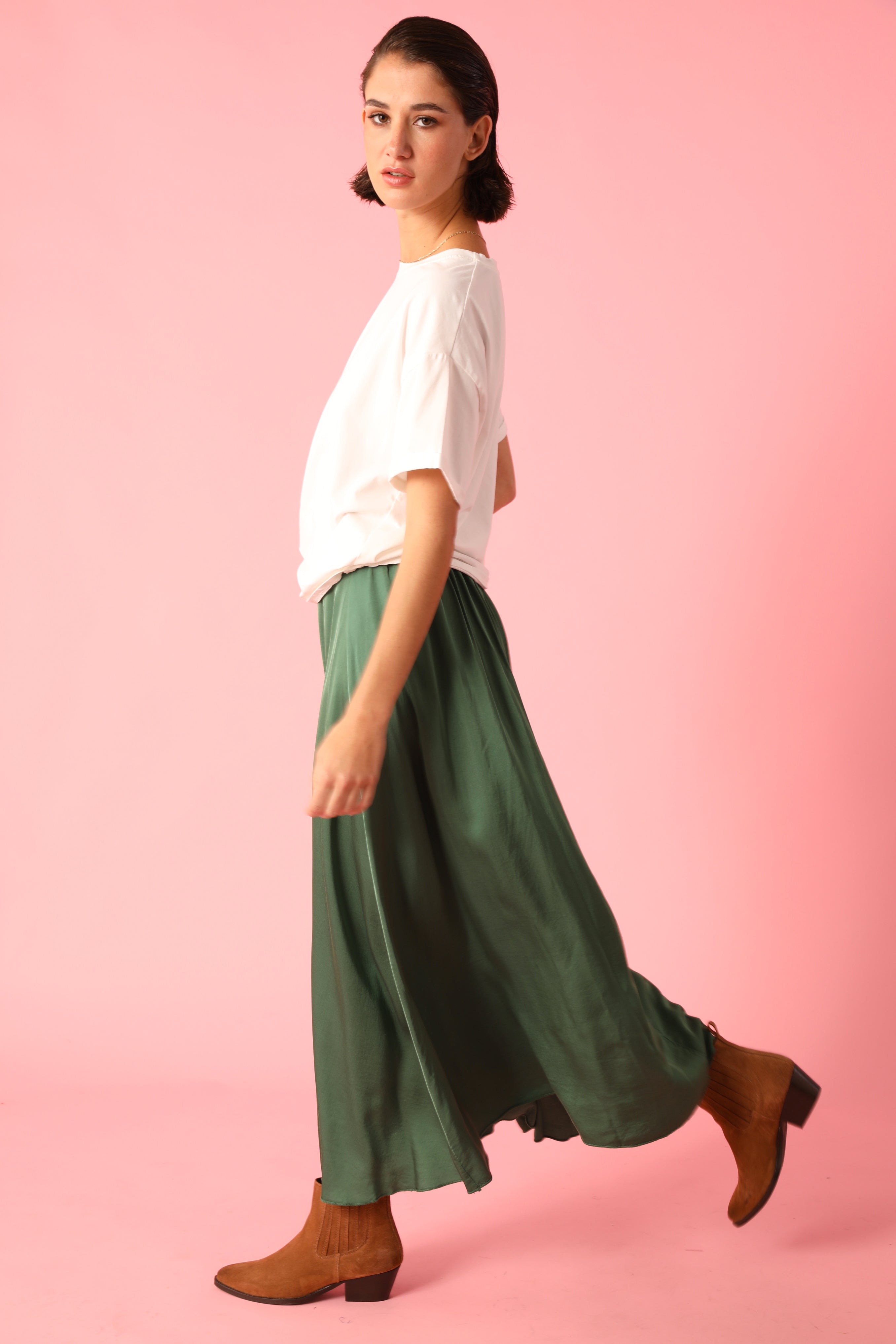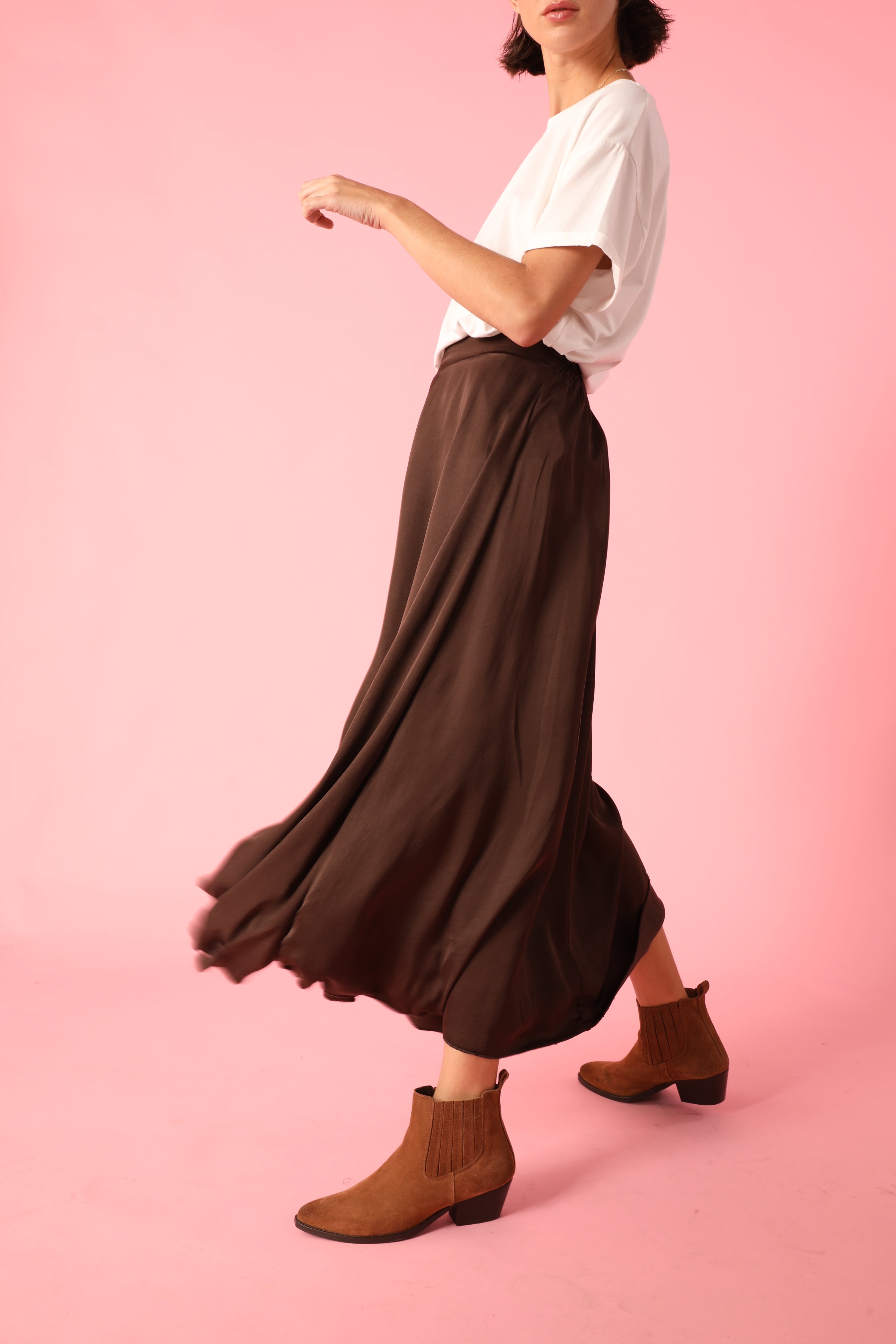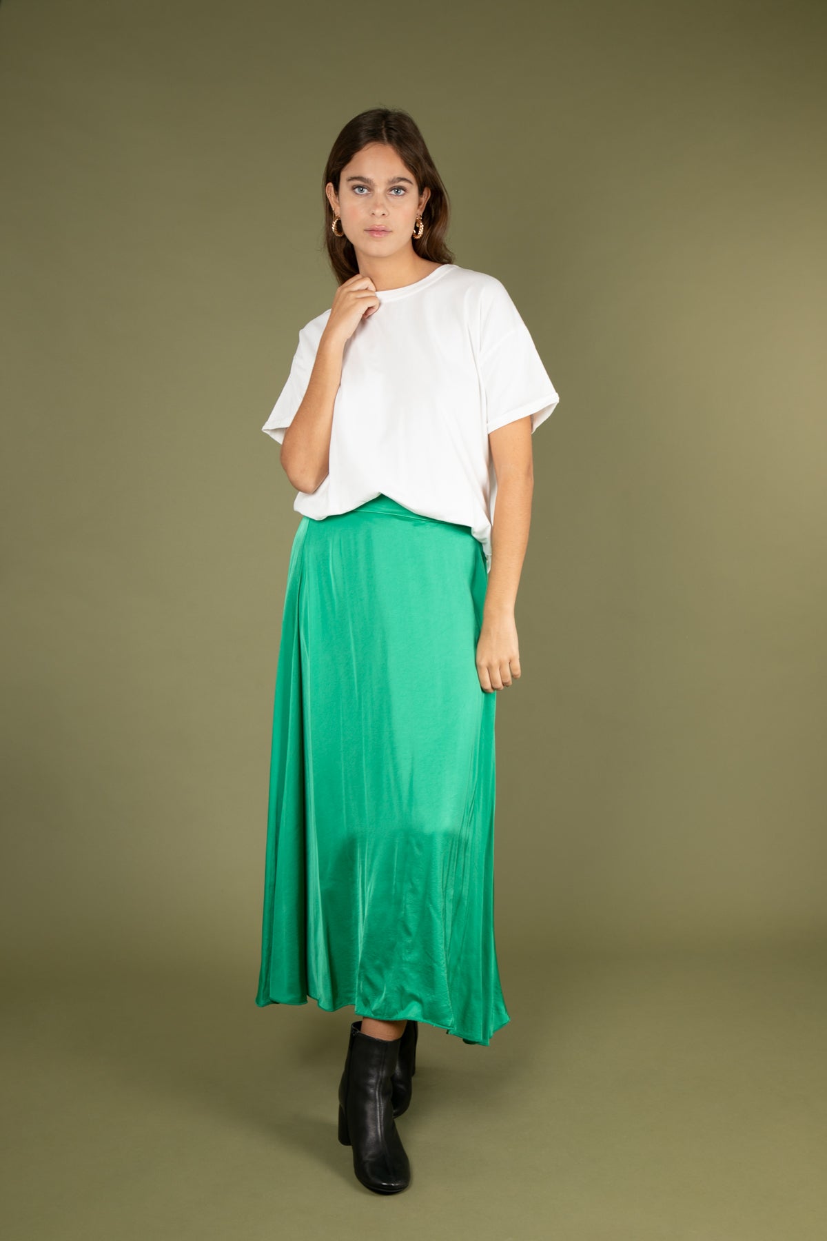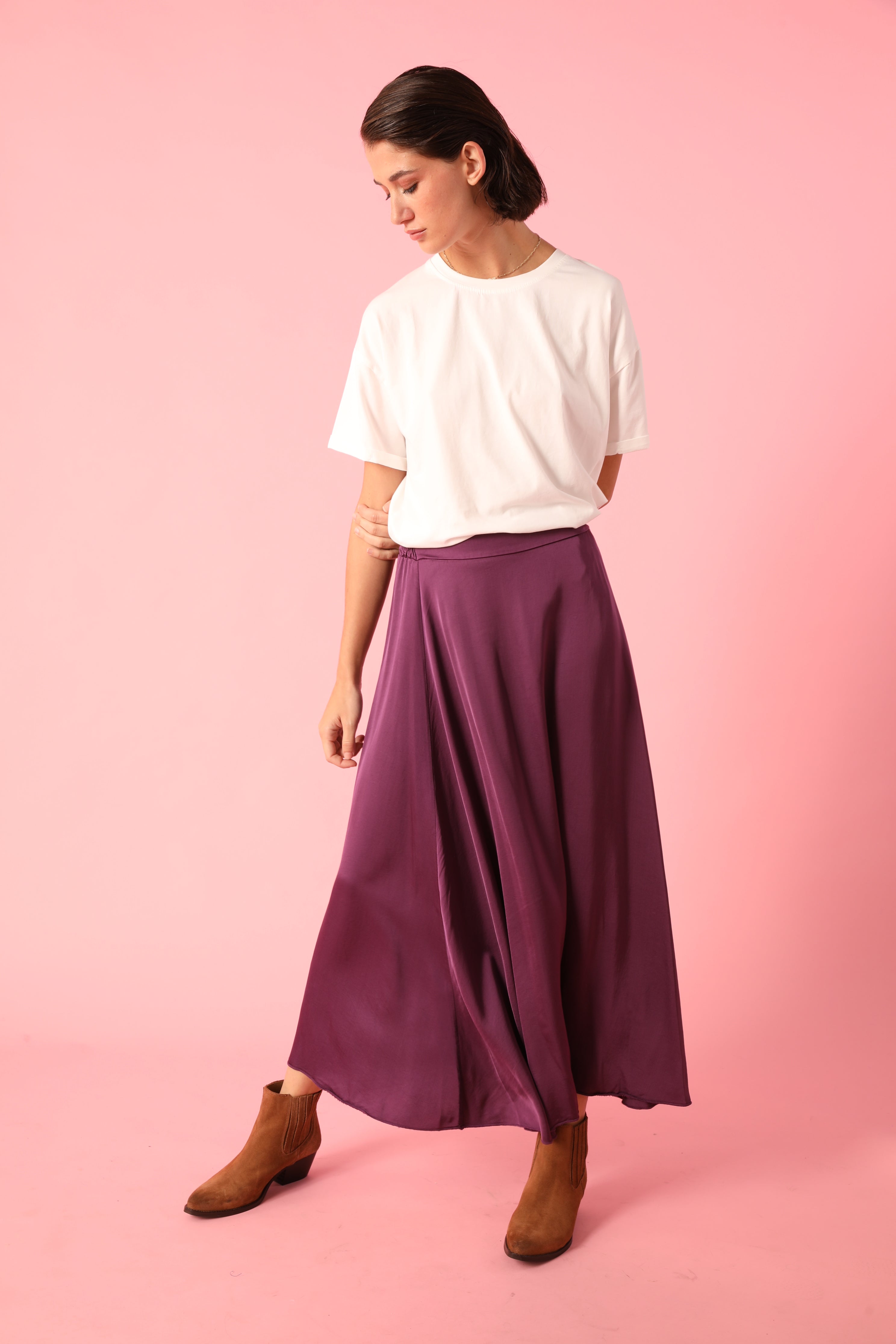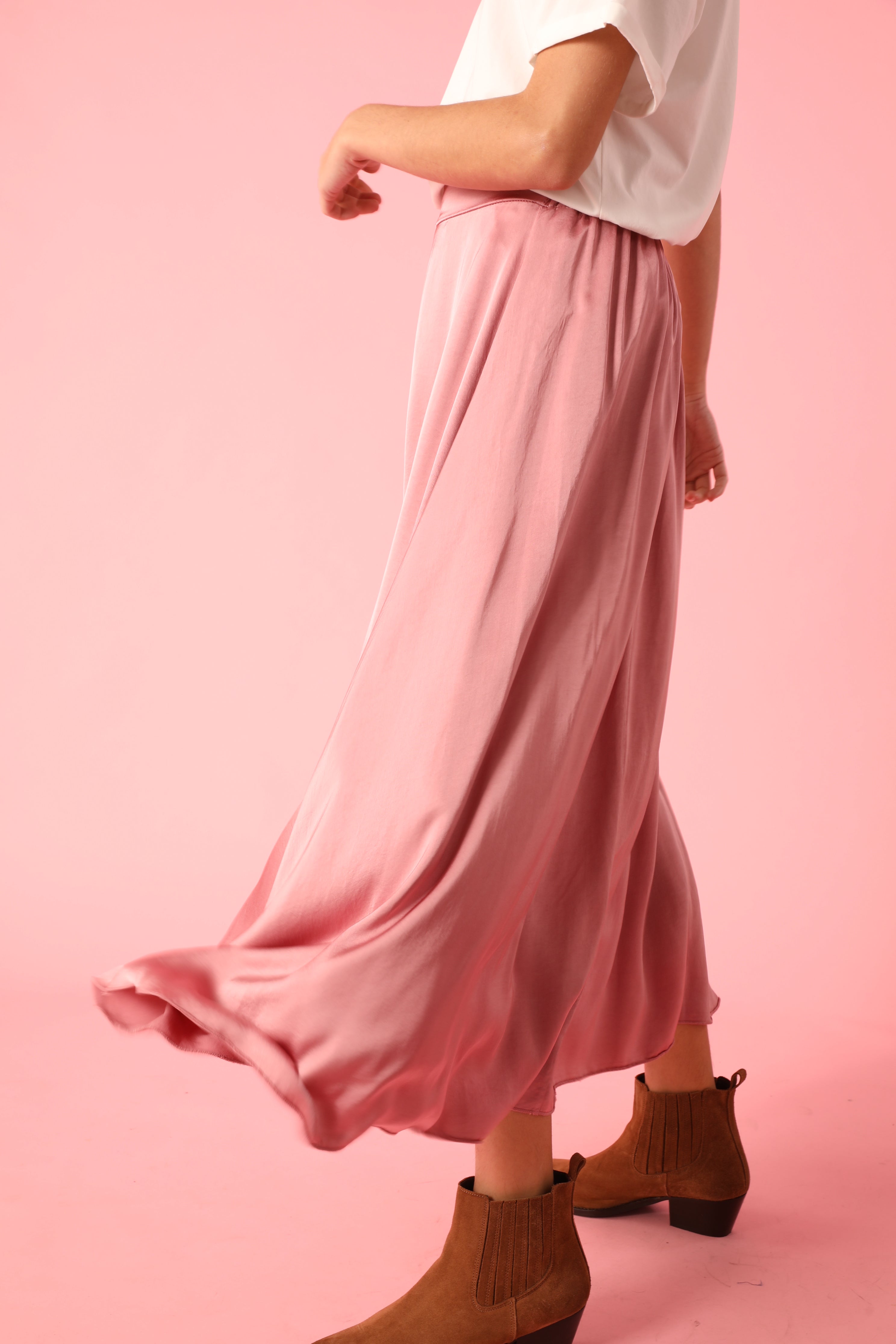 Jupe fluide en soie satinée, taille élastique dans le dos.