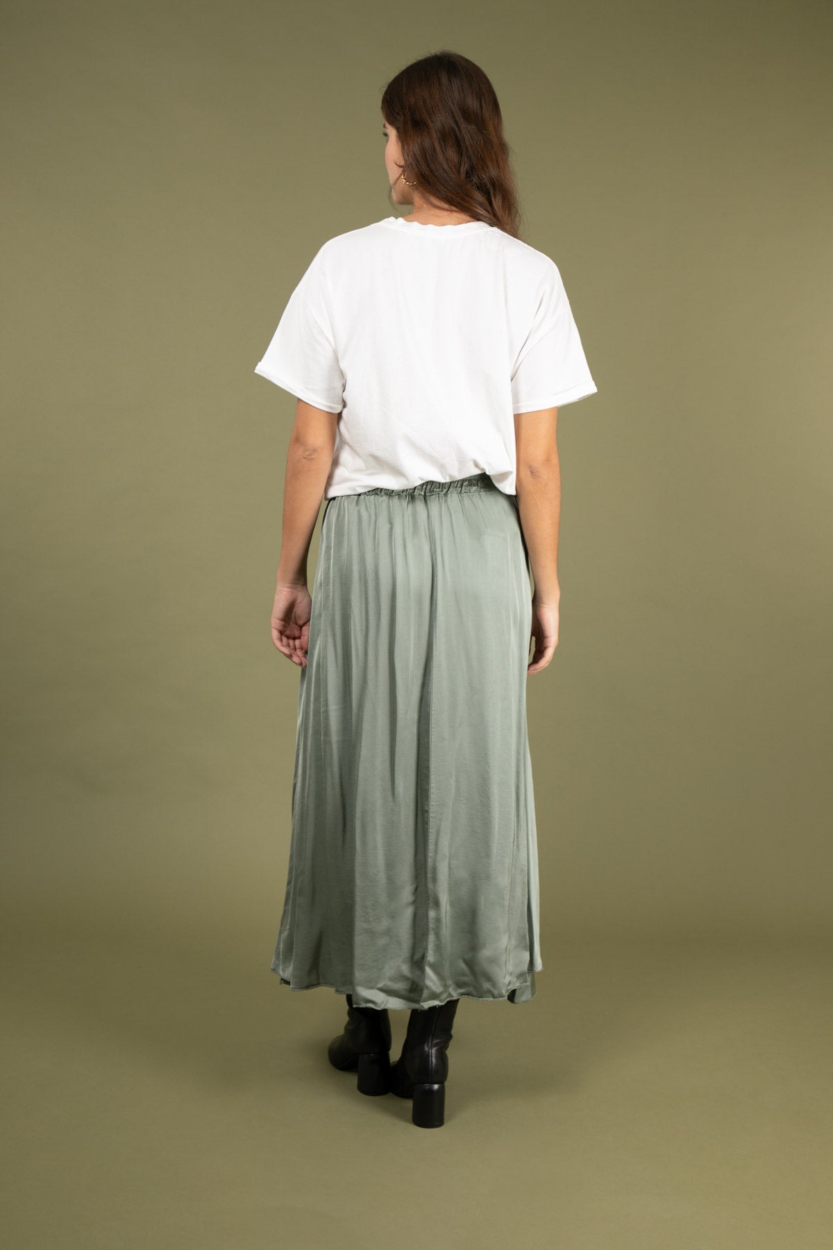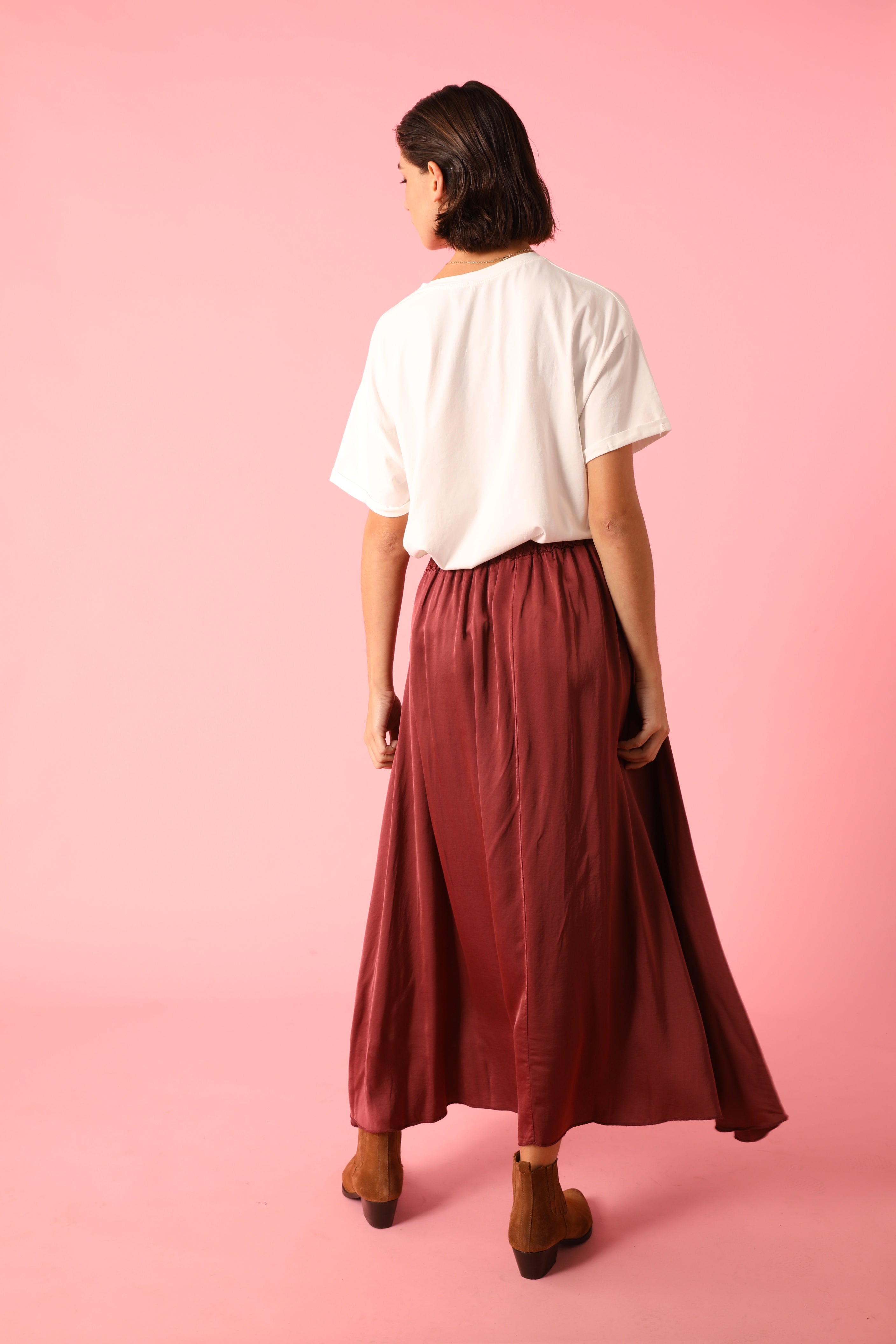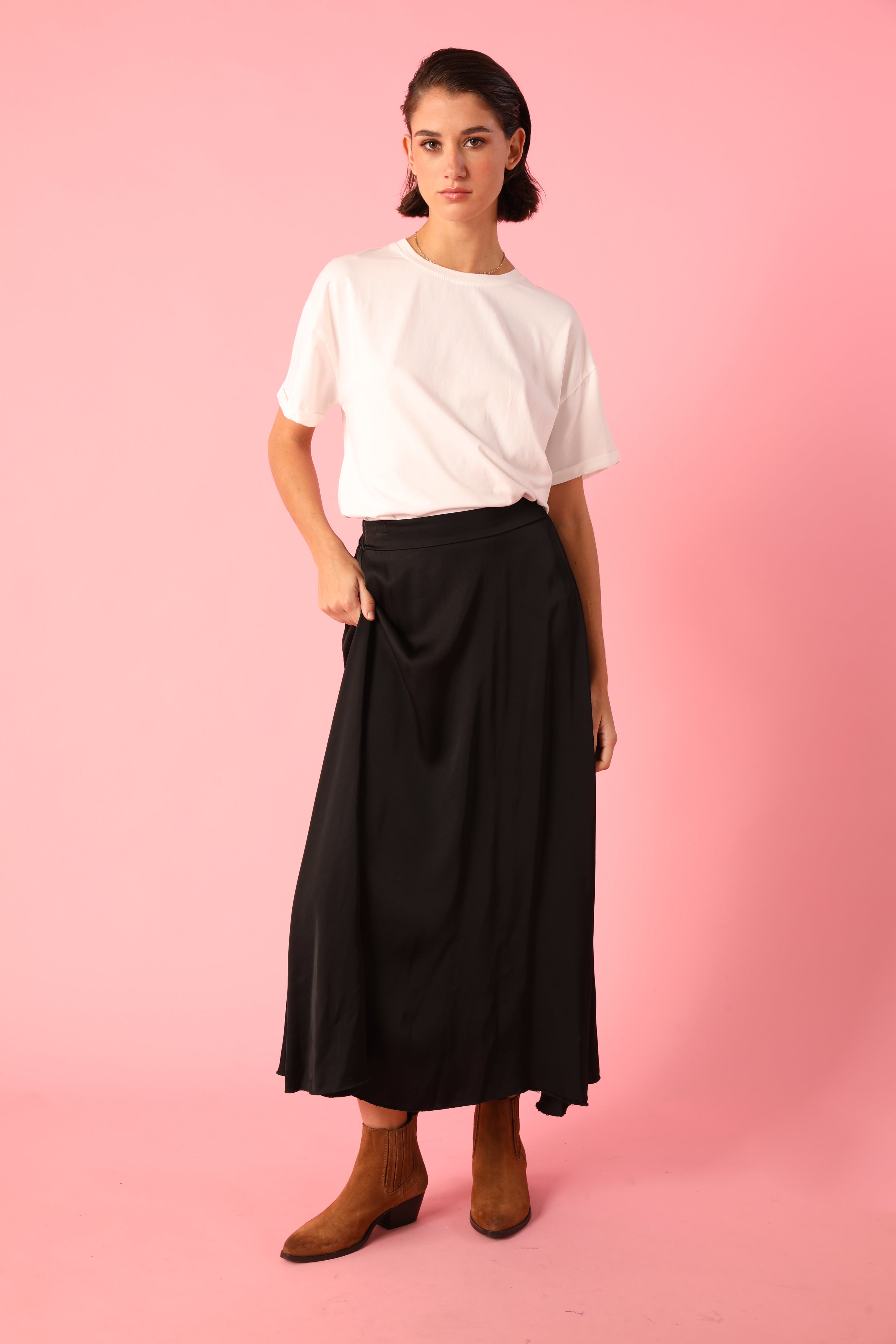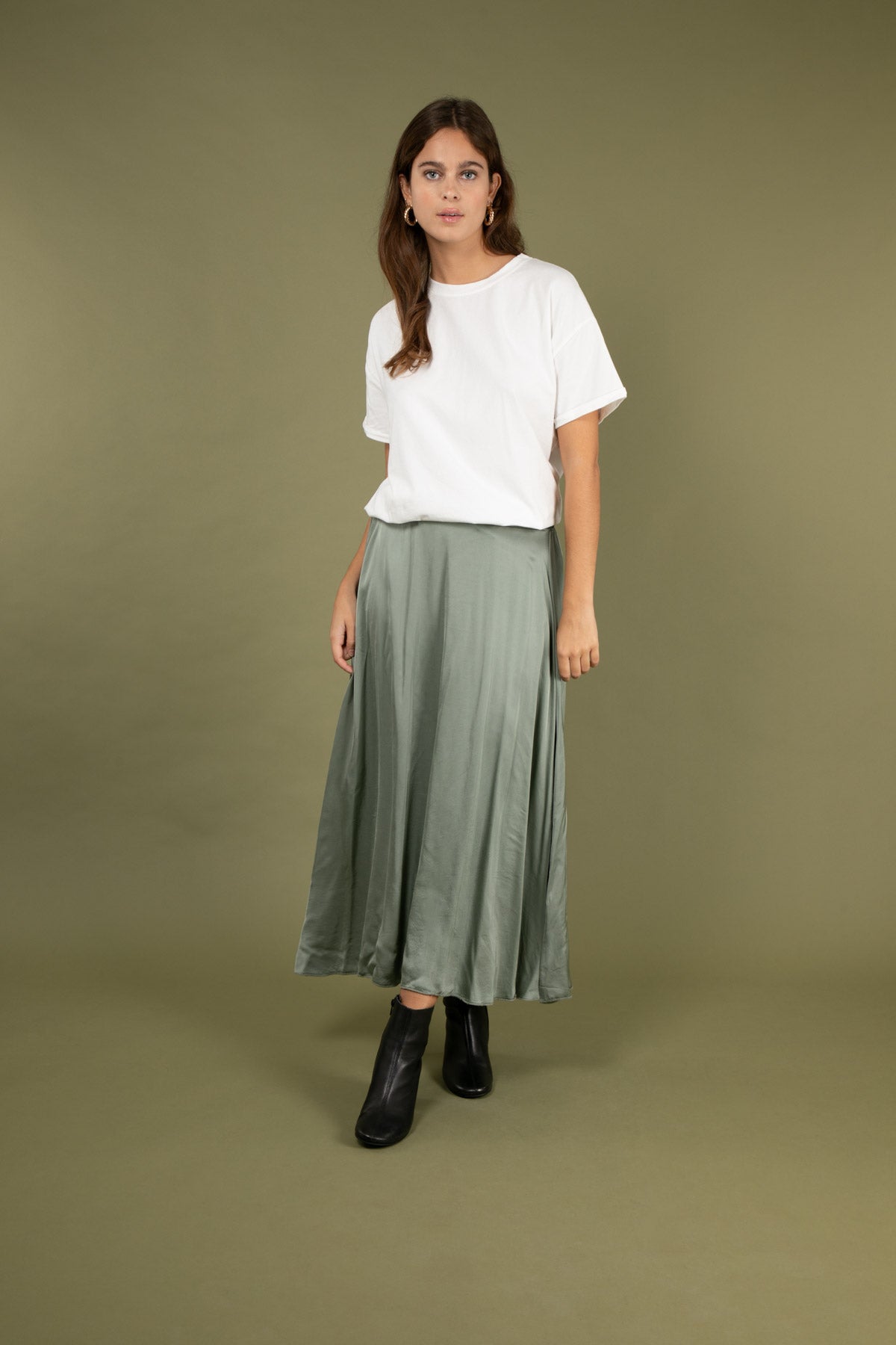 Jupe fluide en soie satinée, taille élastique dans le dos.