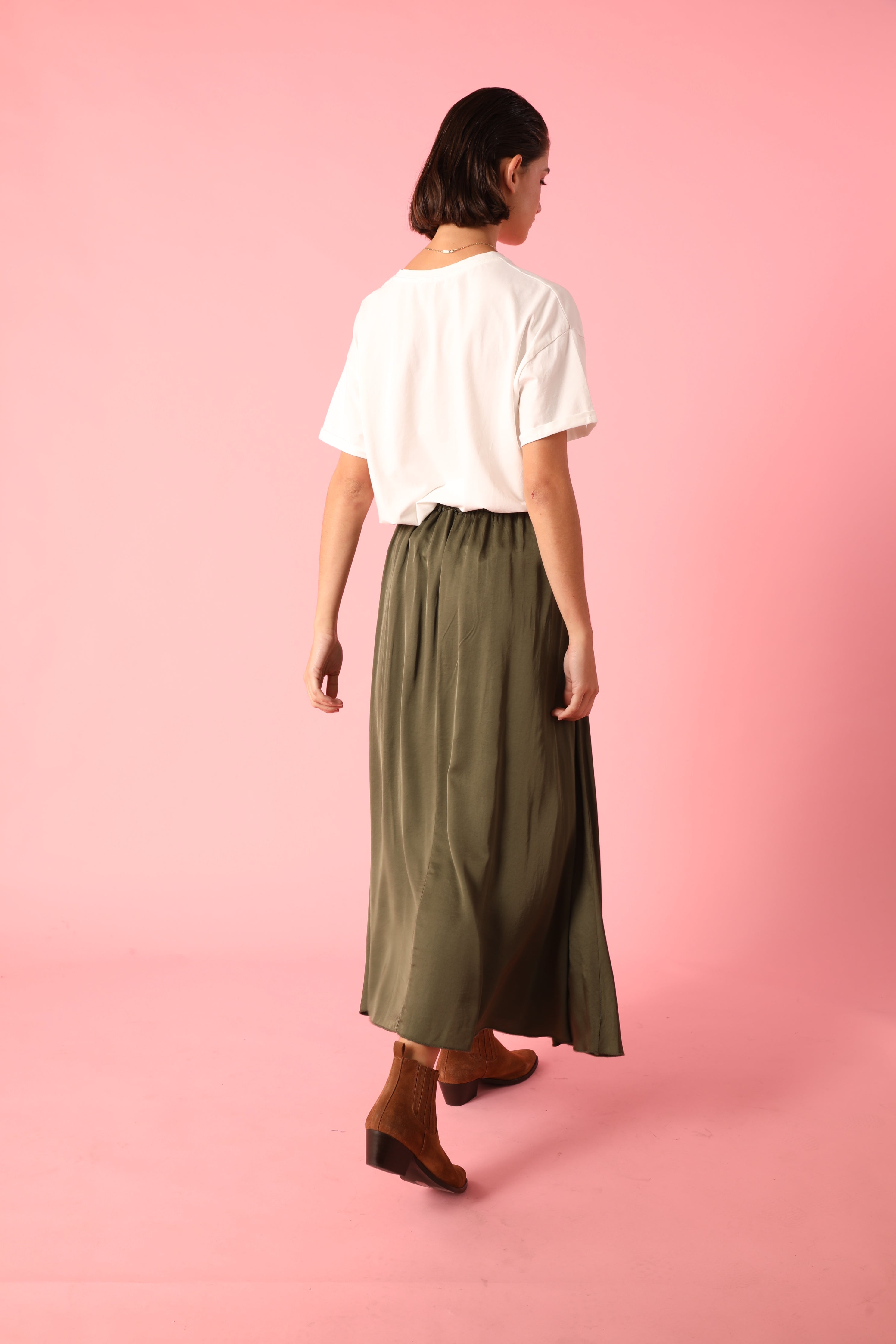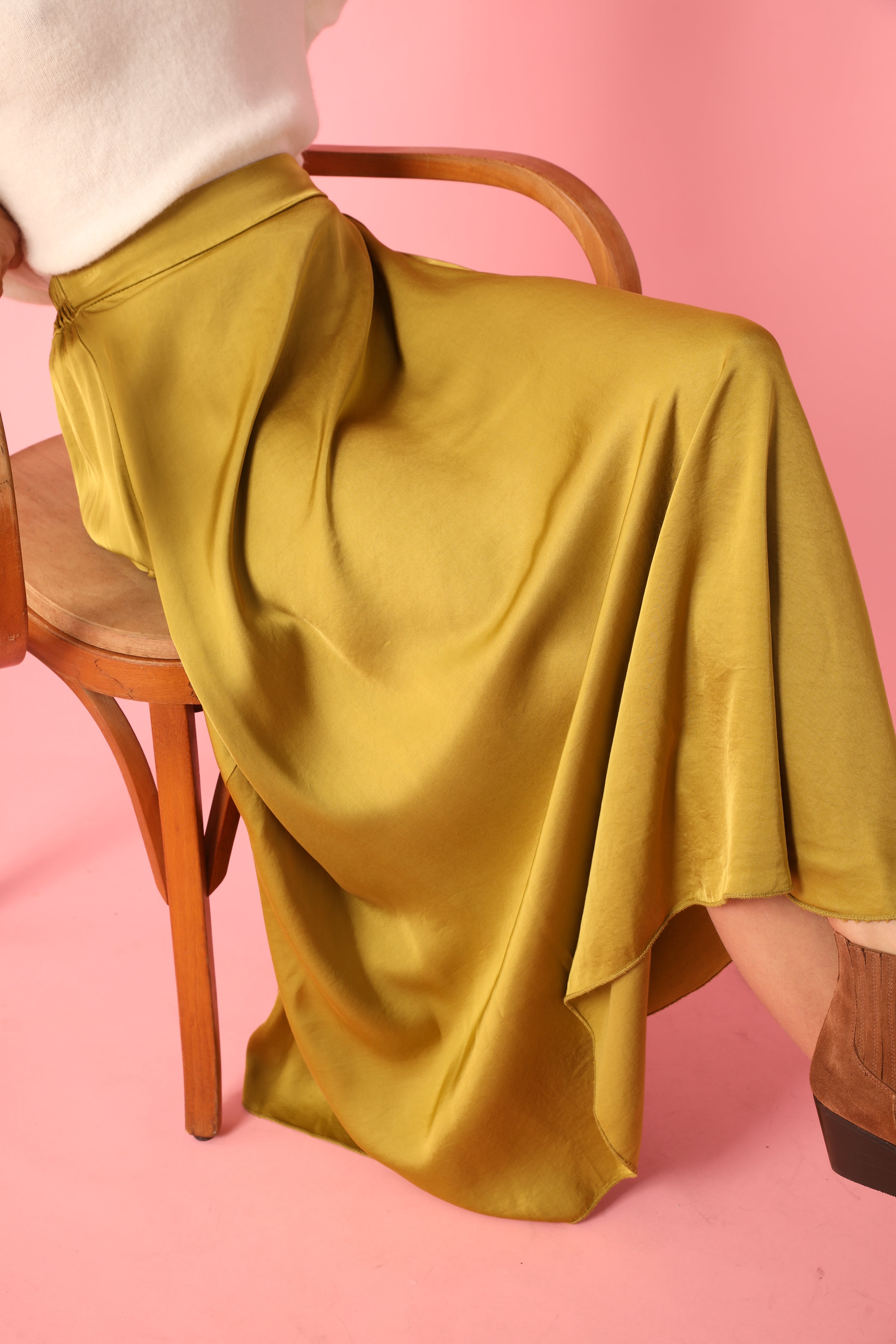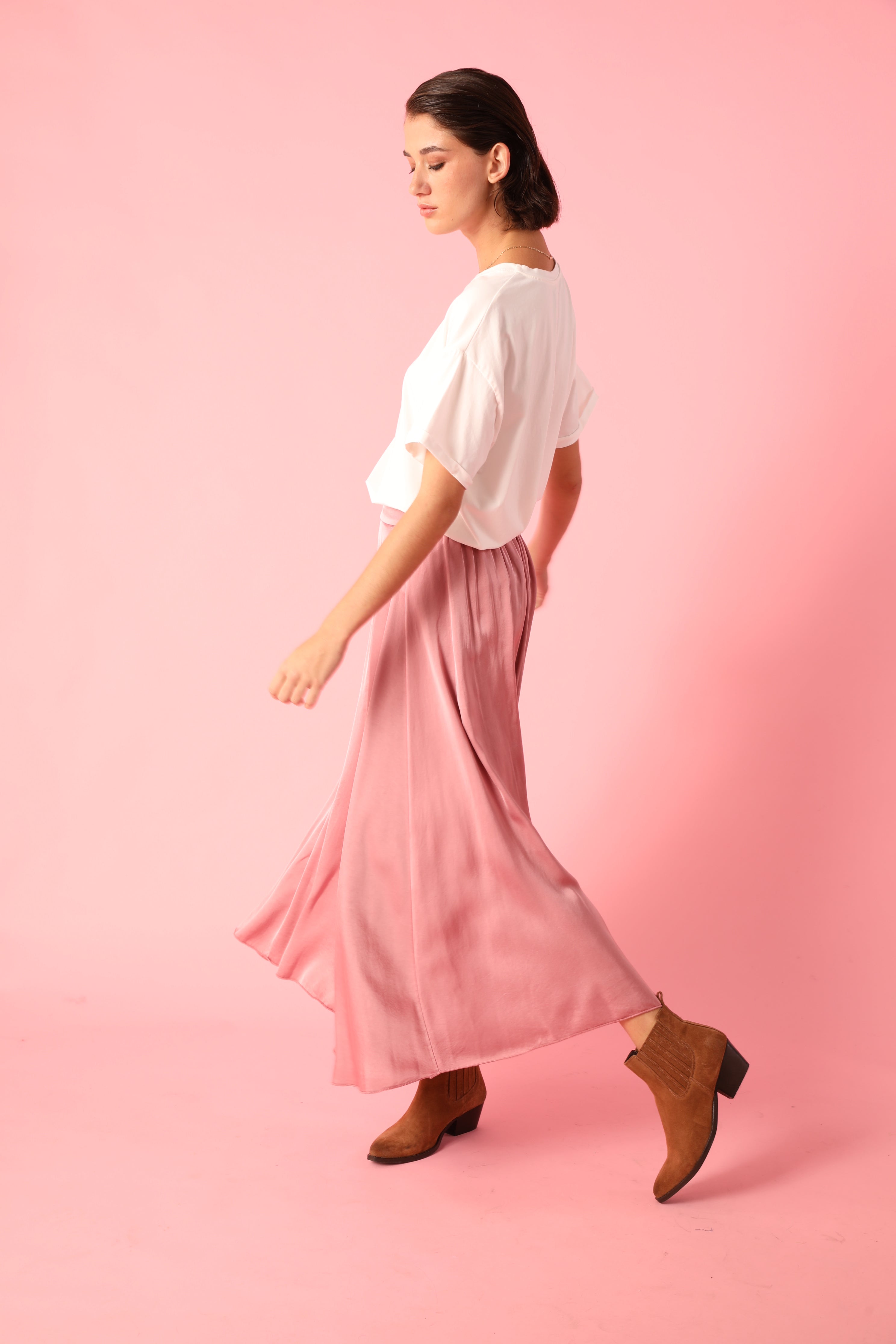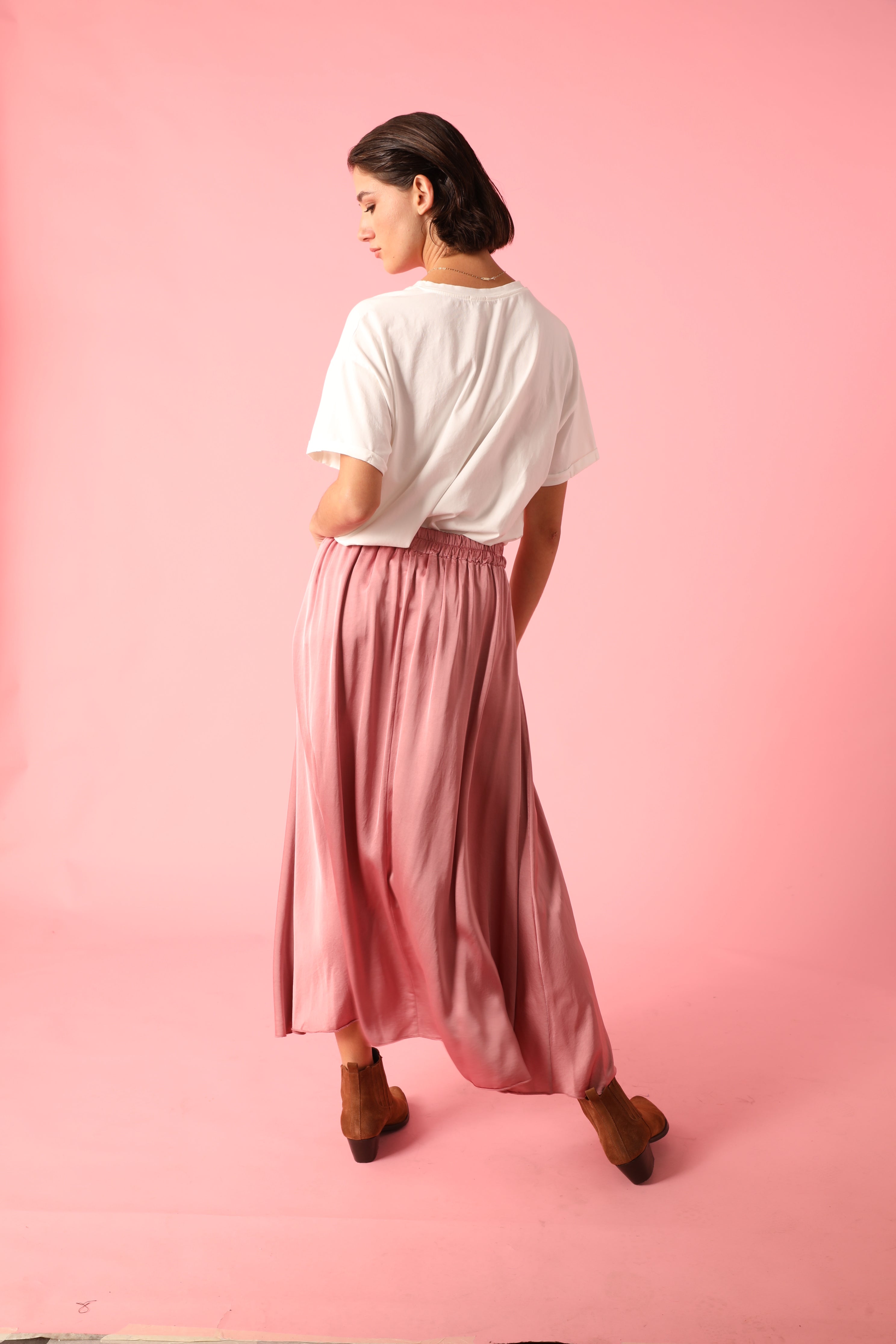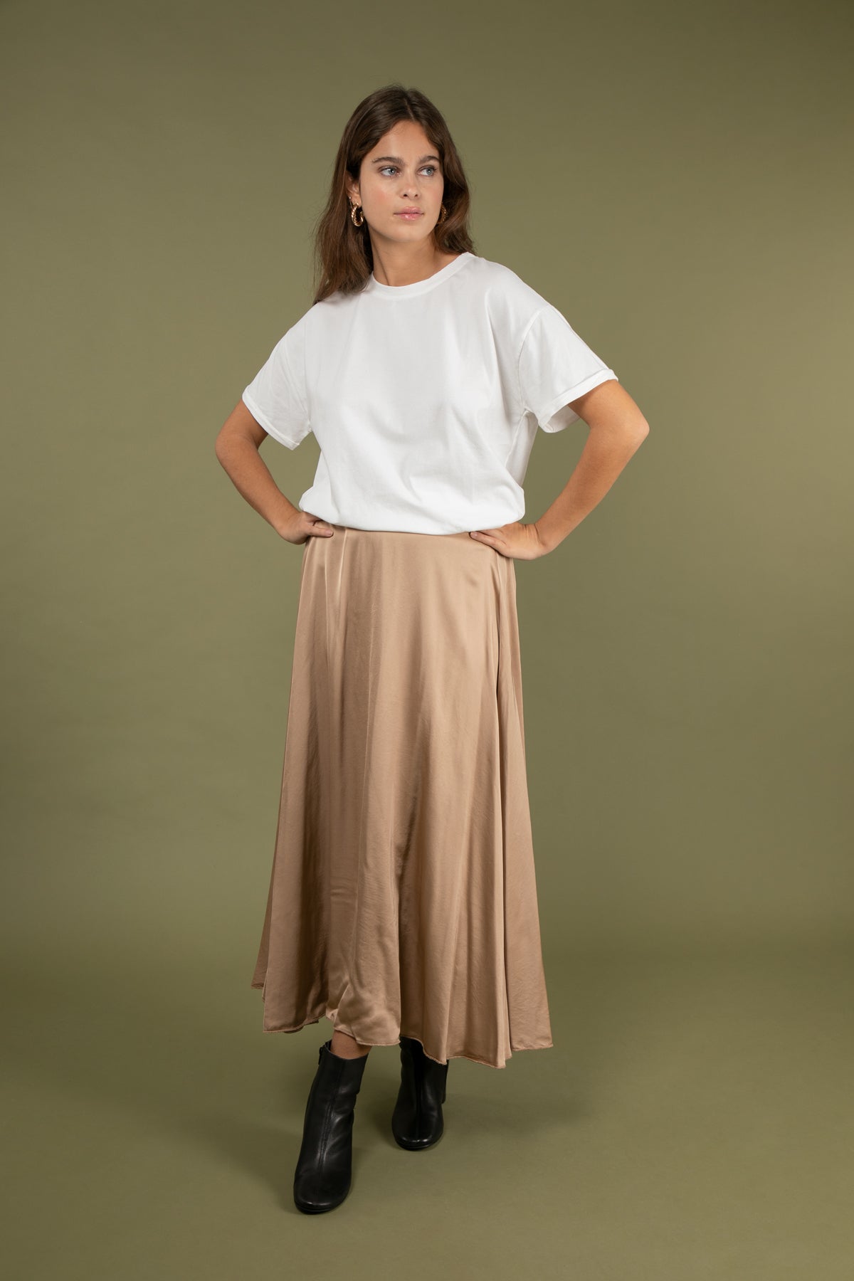 Jupe fluide en soie satinée, taille élastique dans le dos.