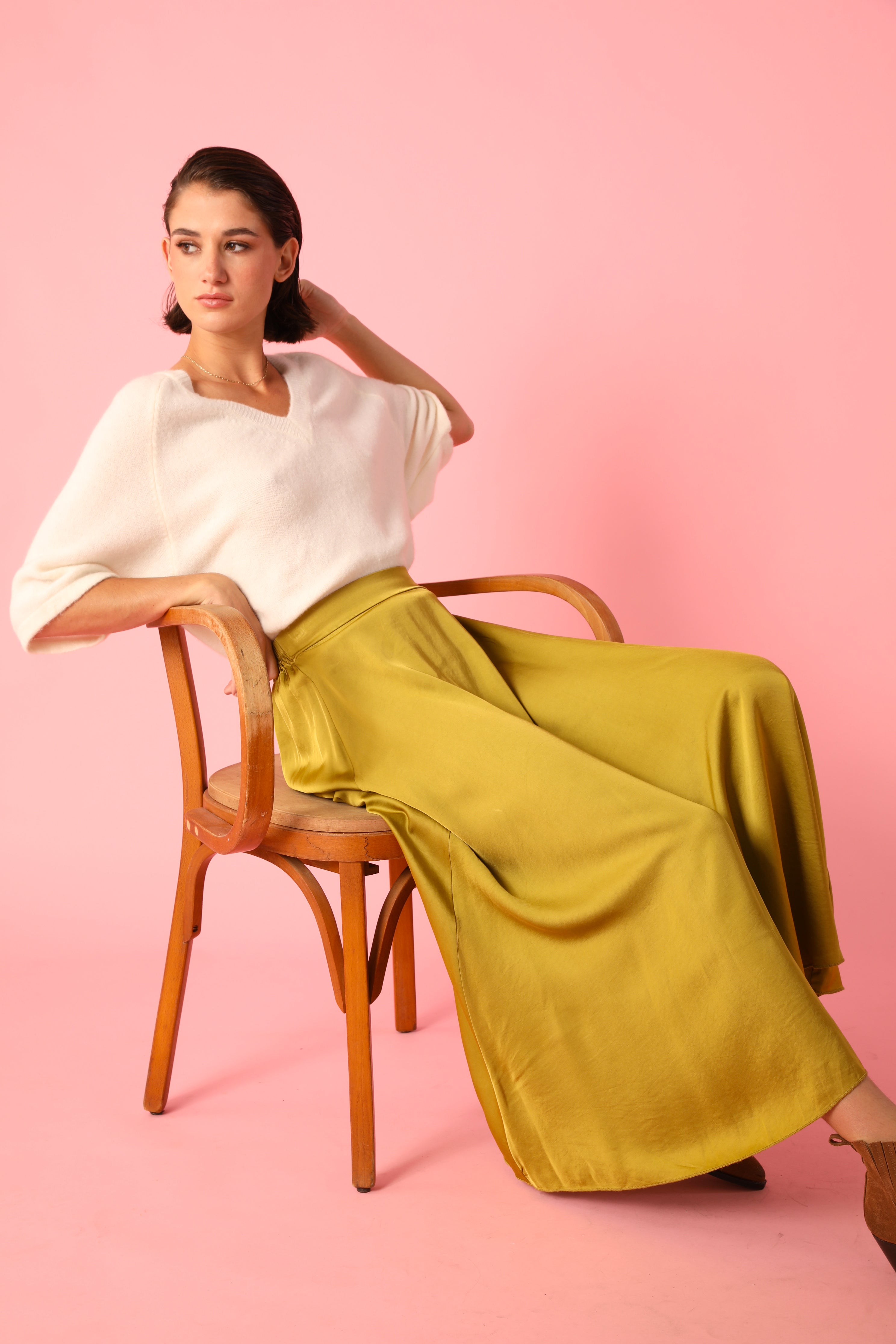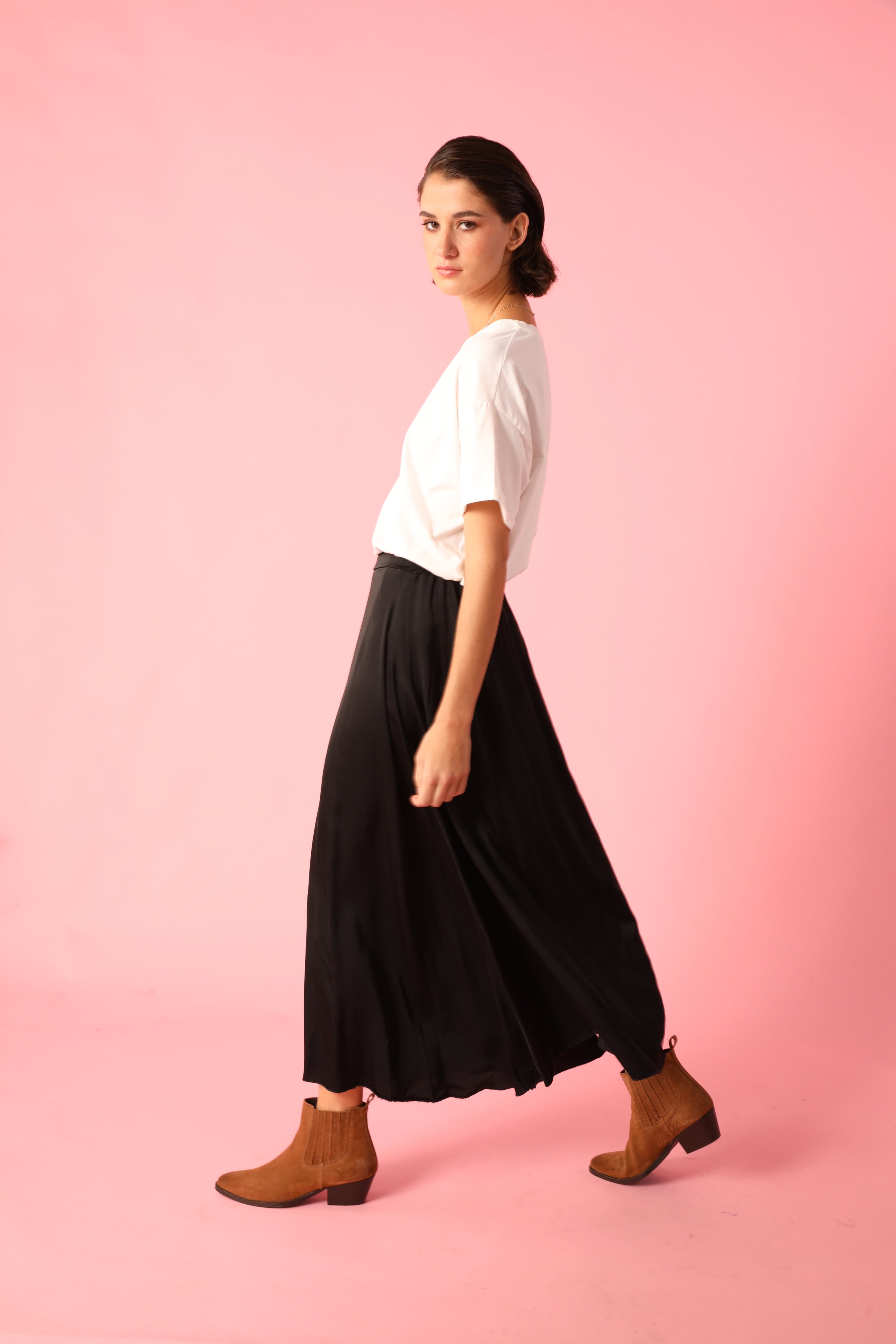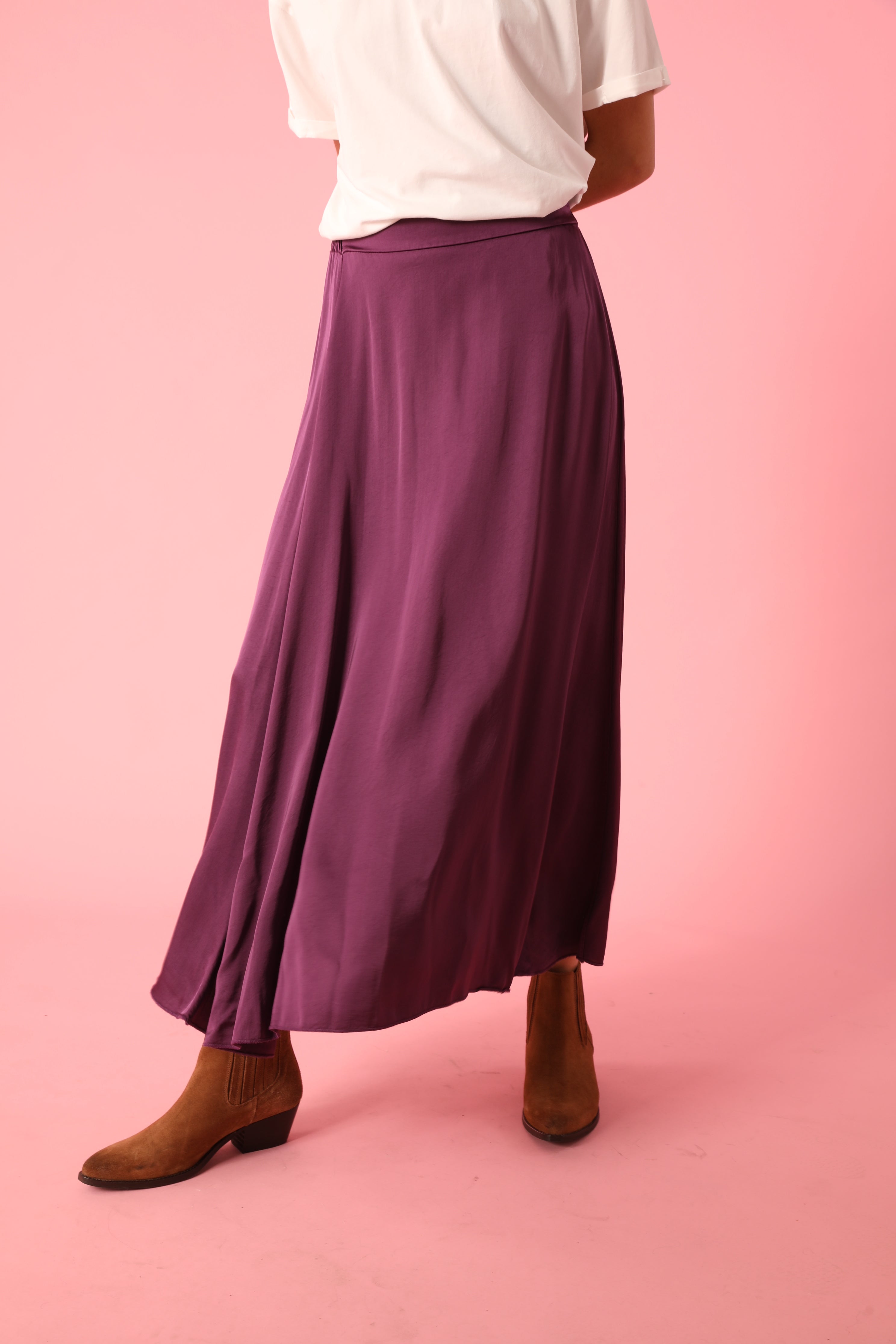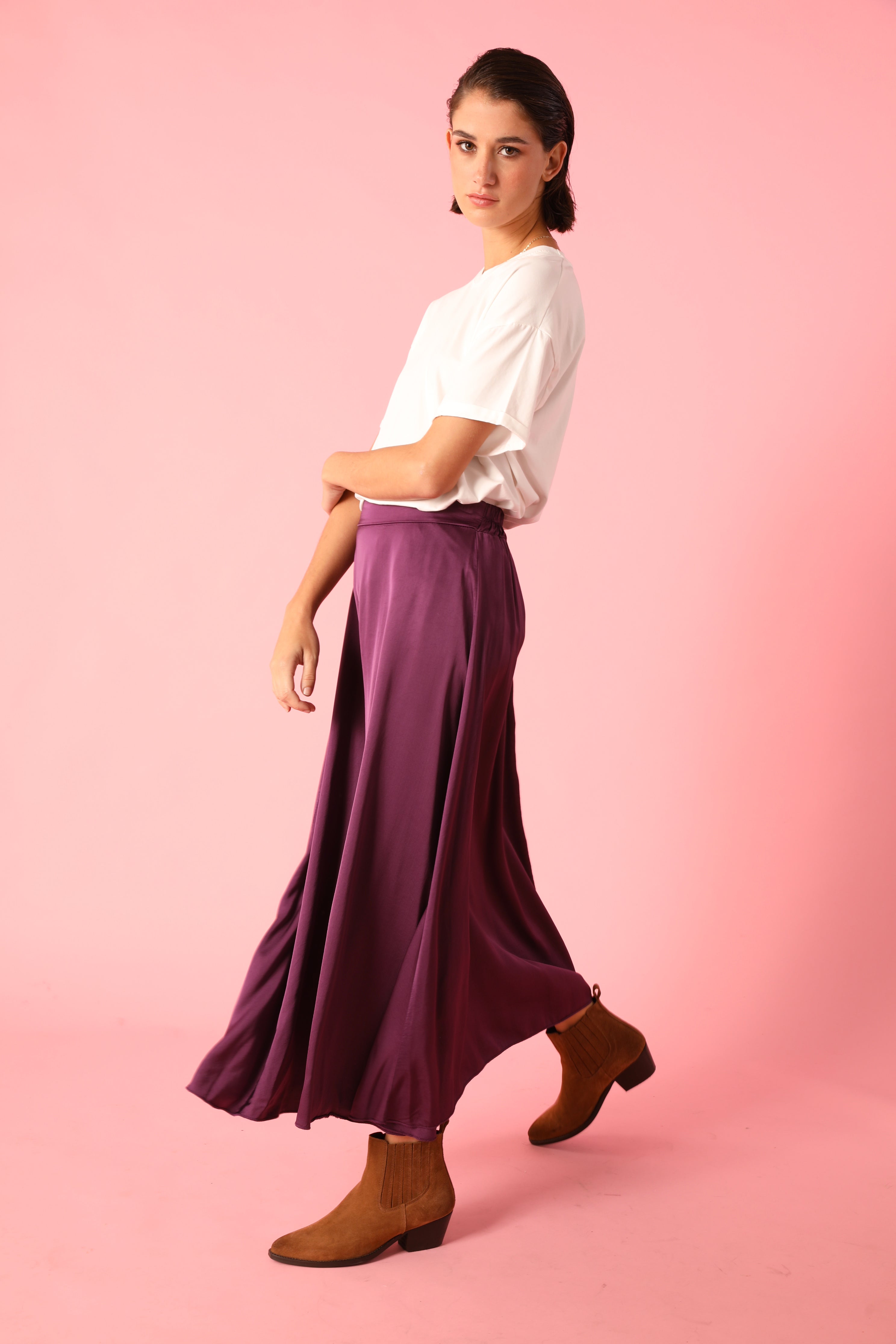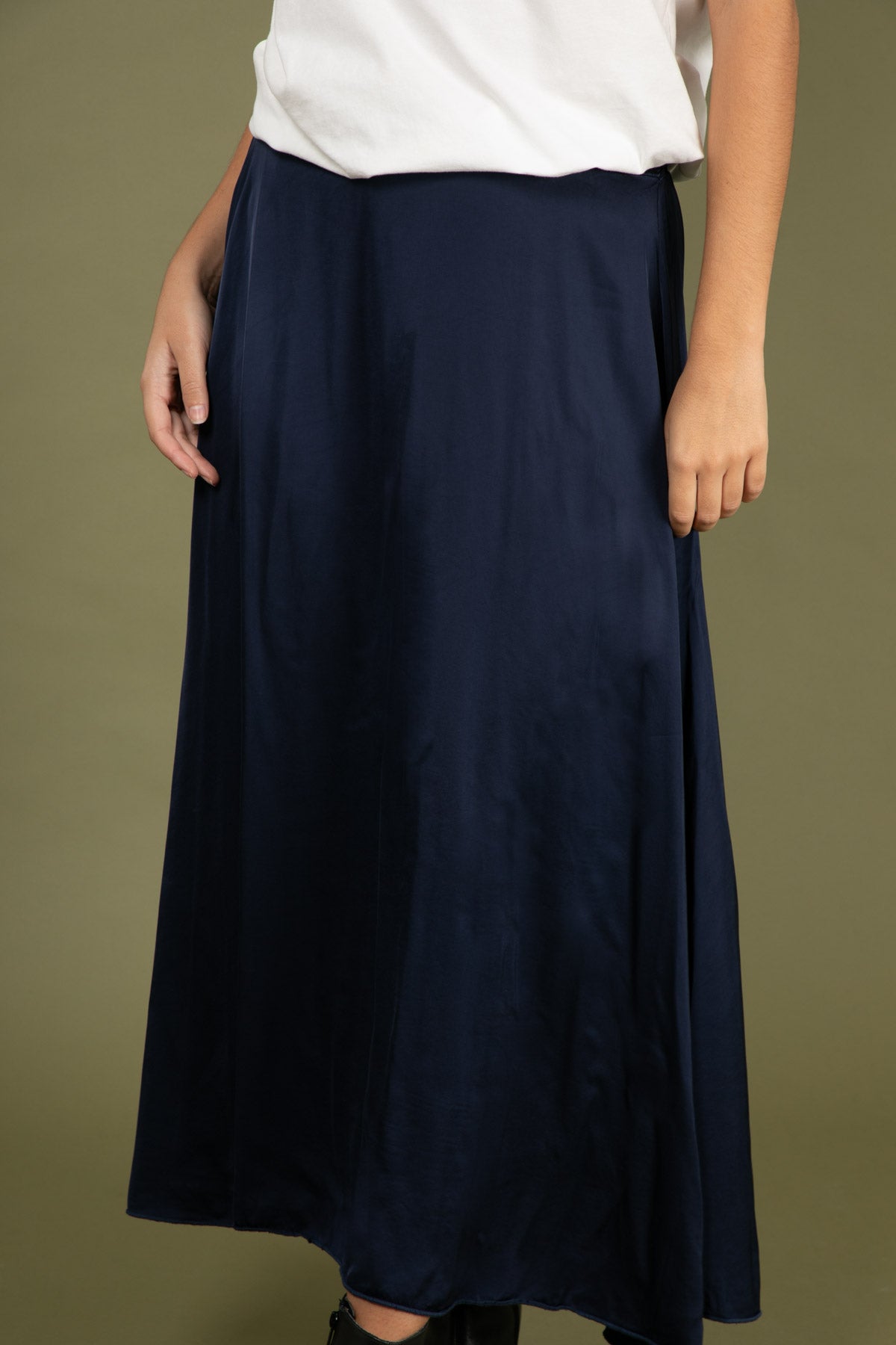 Jupe fluide en soie satinée, taille élastique dans le dos.