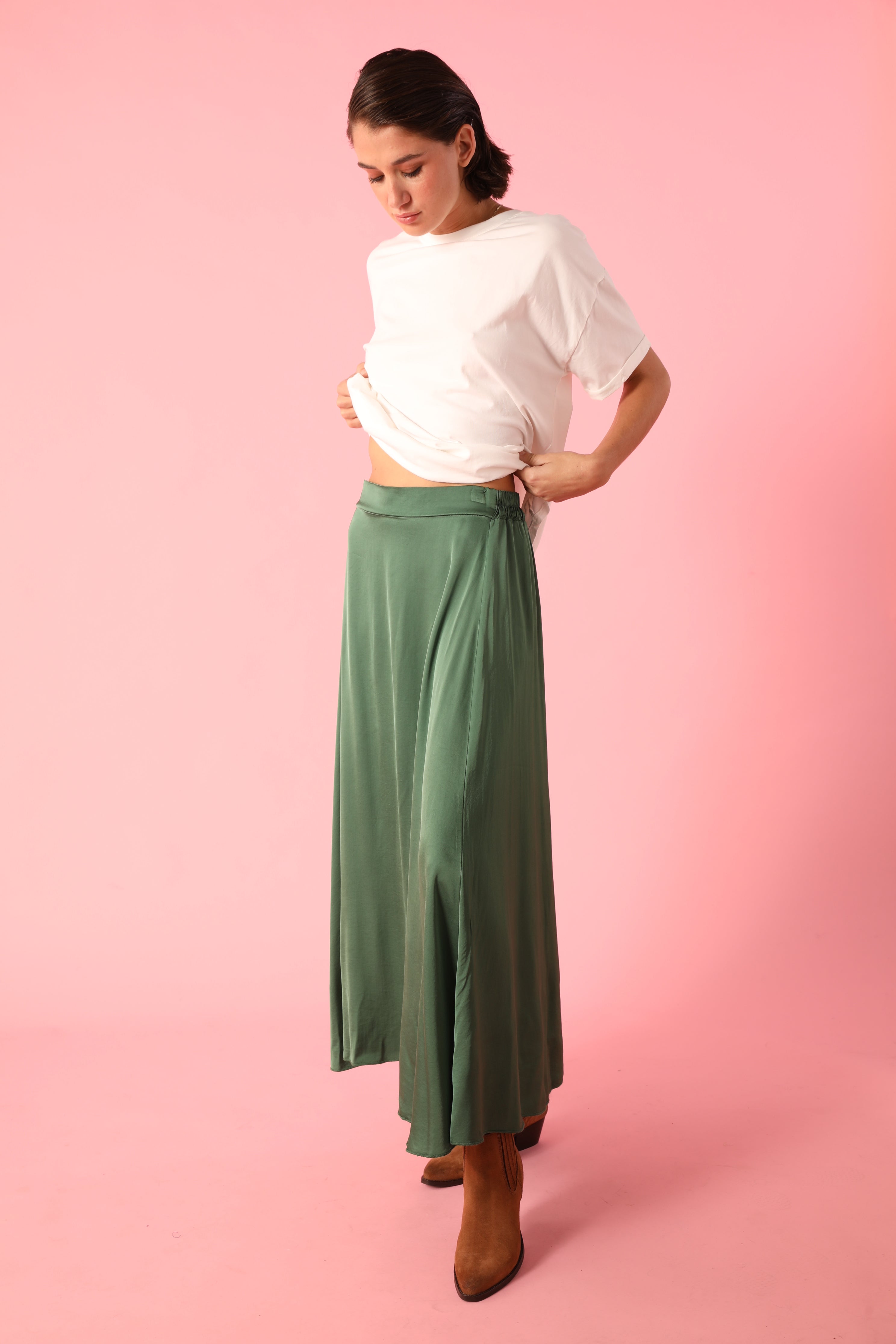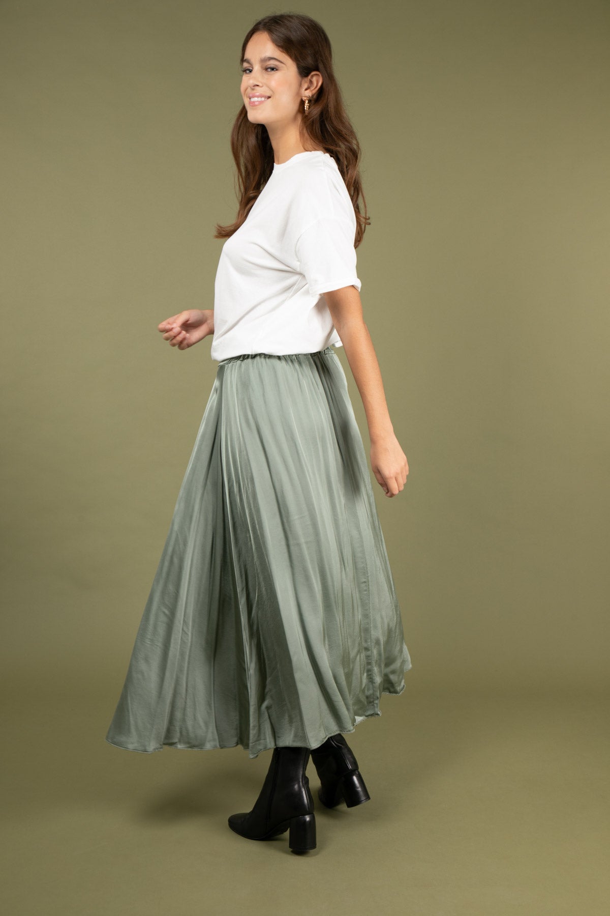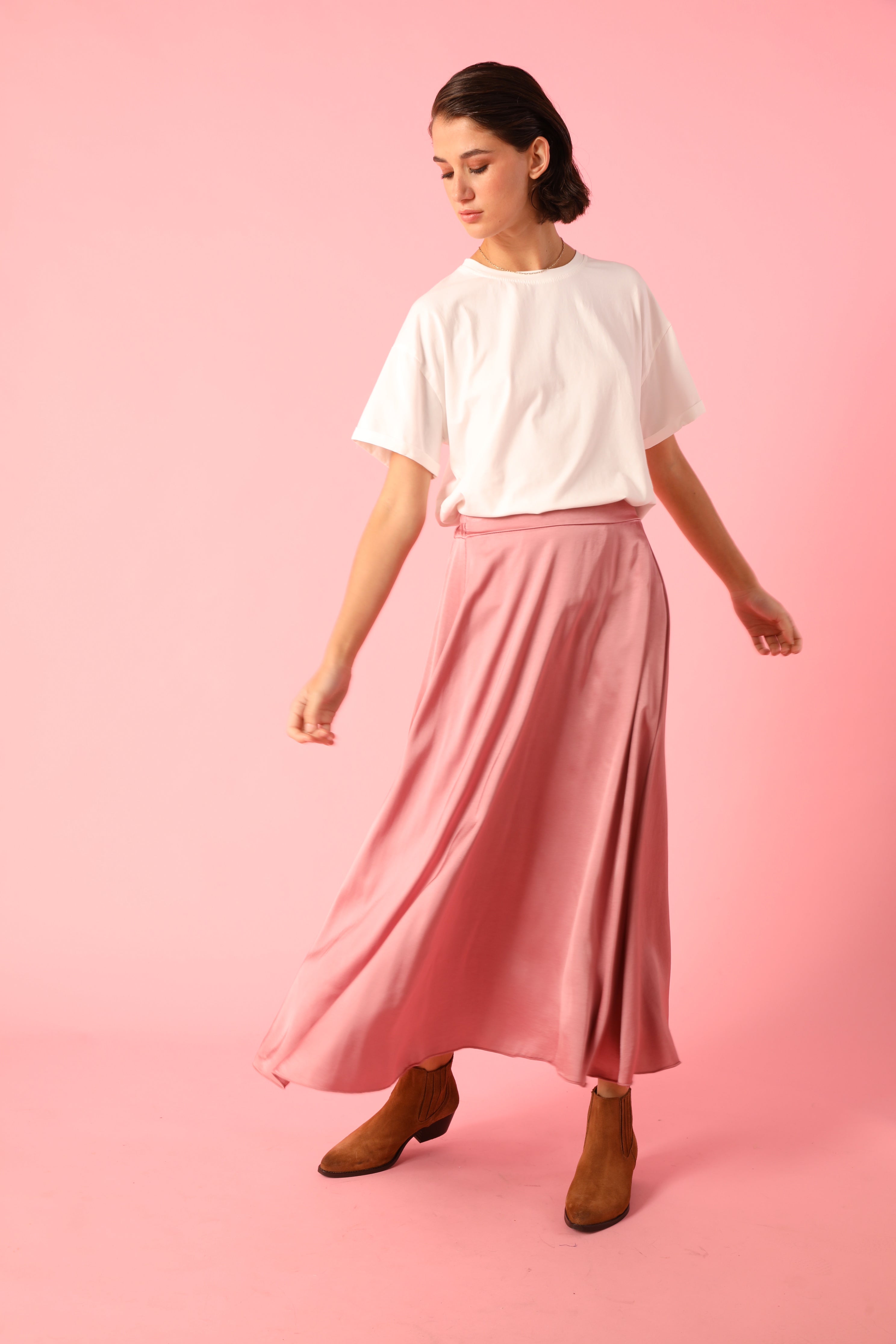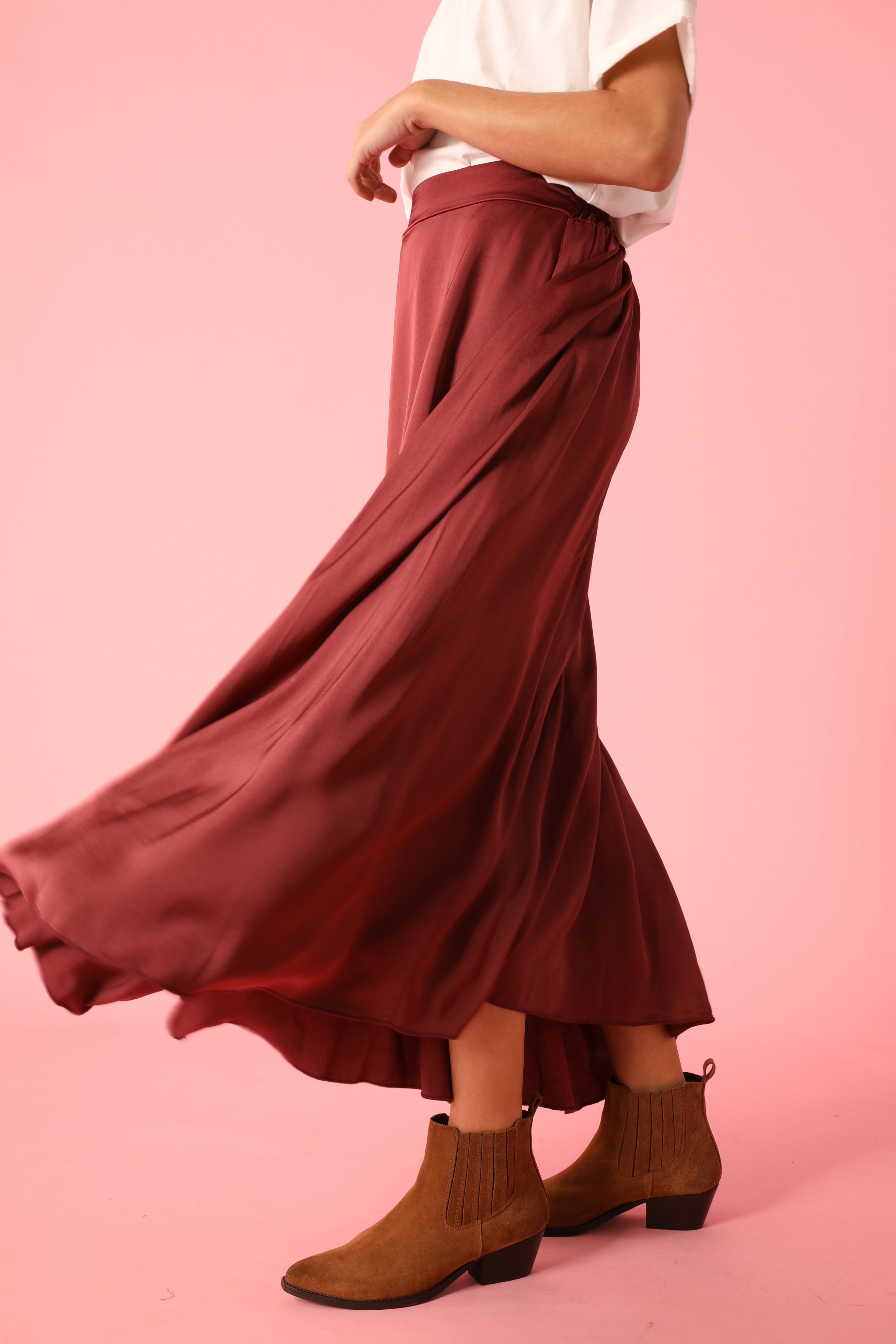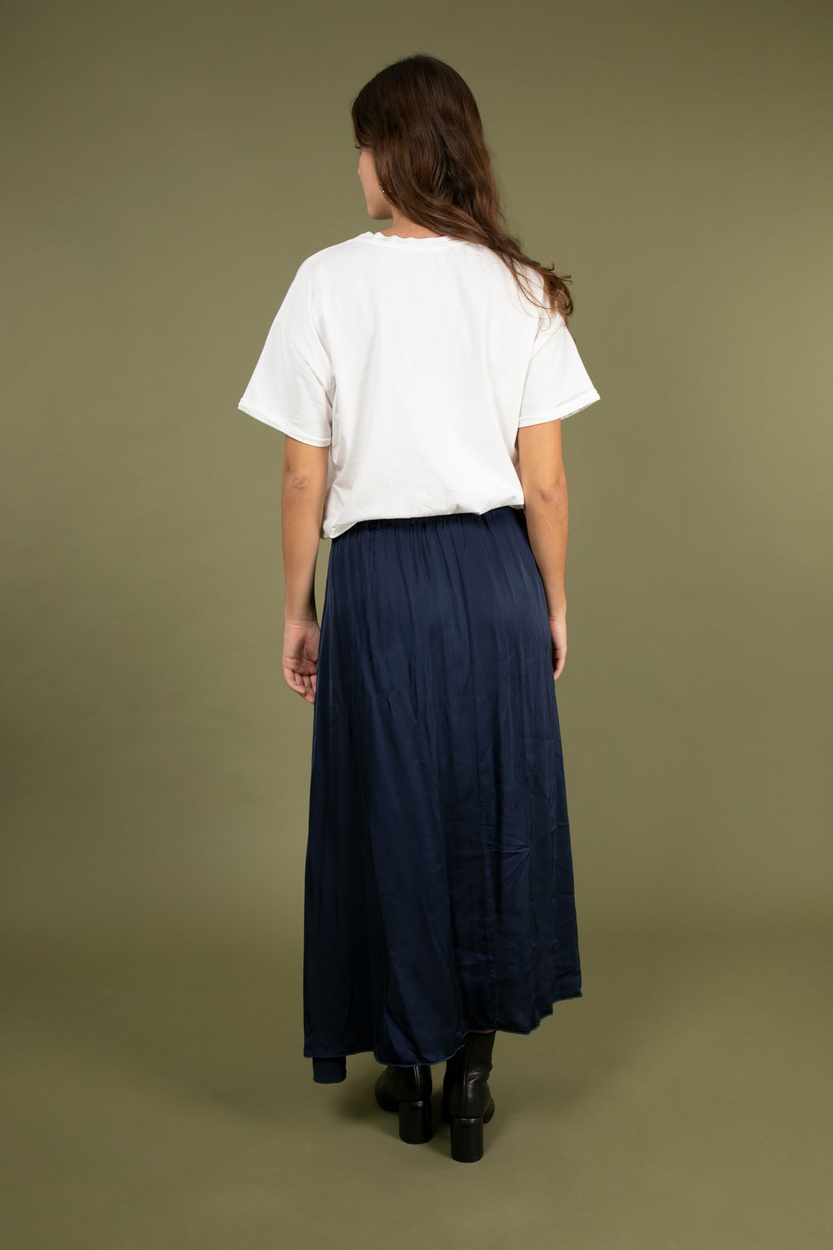 Jupe fluide en soie satinée, taille élastique dans le dos.